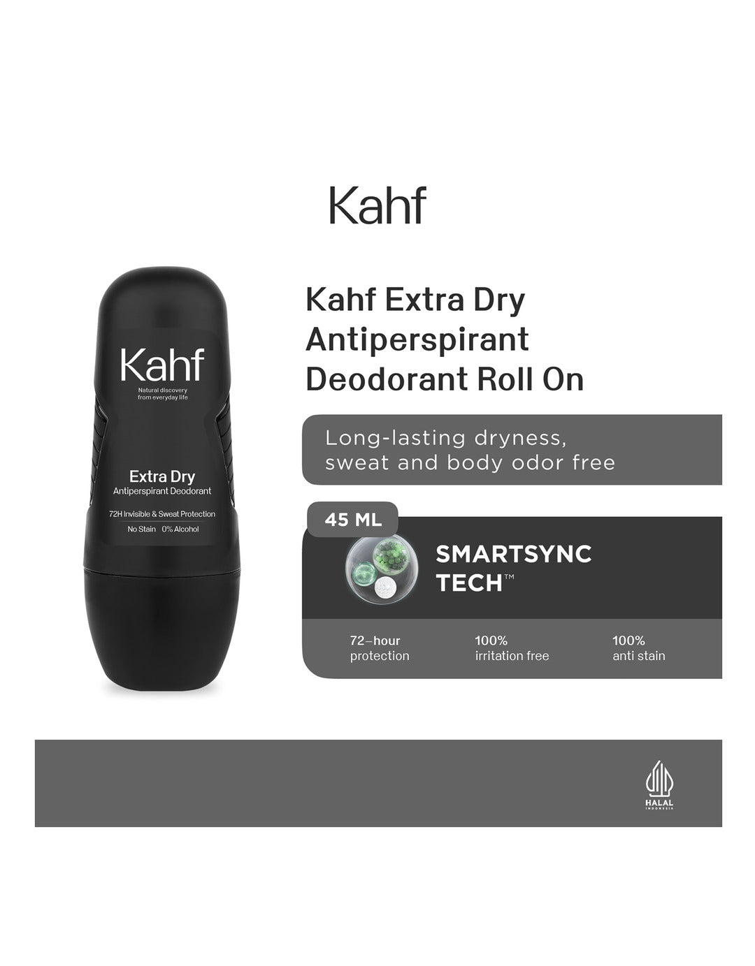 Kahf Antiperspirant Deodorant Roll On 45 ml merupakan Nature Charged AP Deo Pertama di Indonesia yang melindungi dari 3 jenis keringat serta bebas iritasi dengan SmartSync Deo Care Technology dan berikan aroma signature Kahf untuk kesegaran sepanjang hari.