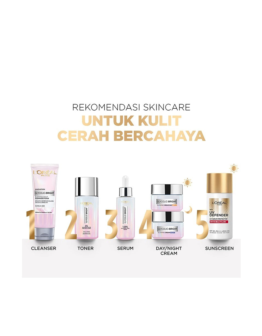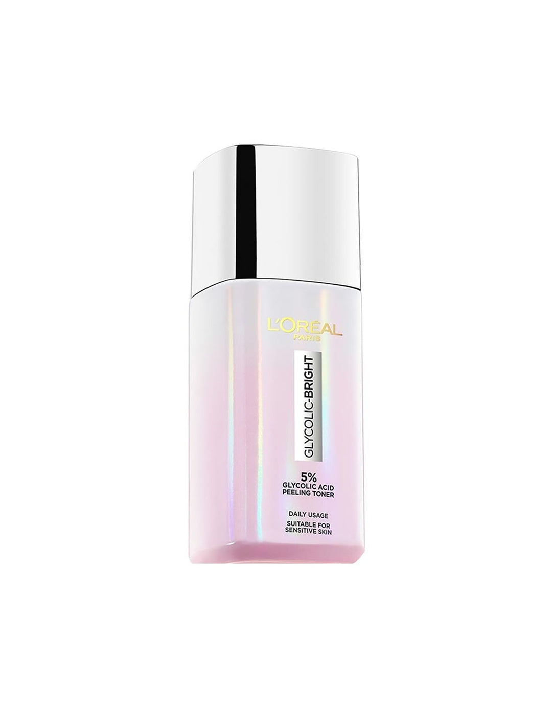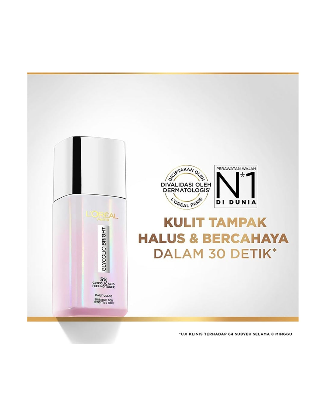 L’Oréal Skincare Laboratories mengembangkan GLYCOLIC-BRIGHT GLOWING PEELING TONER yang diformulasikan dengan 5% Glycolic Acid, bahan yang digunakan oleh dermatologis untuk prosedur peeling, diformulasikan untuk hasil yang optimal dan sesuai digunakan setiap hari. Terbukti secara klinis untuk membuat kulit tampak segar, cerah, dan bercahaya. Diuji oleh dermatologis pada semua warna kulit.