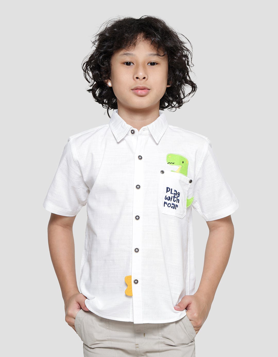 Little M Oxford Aplikasi Dino Kemeja Lengan Pendek Anak Laki-Laki