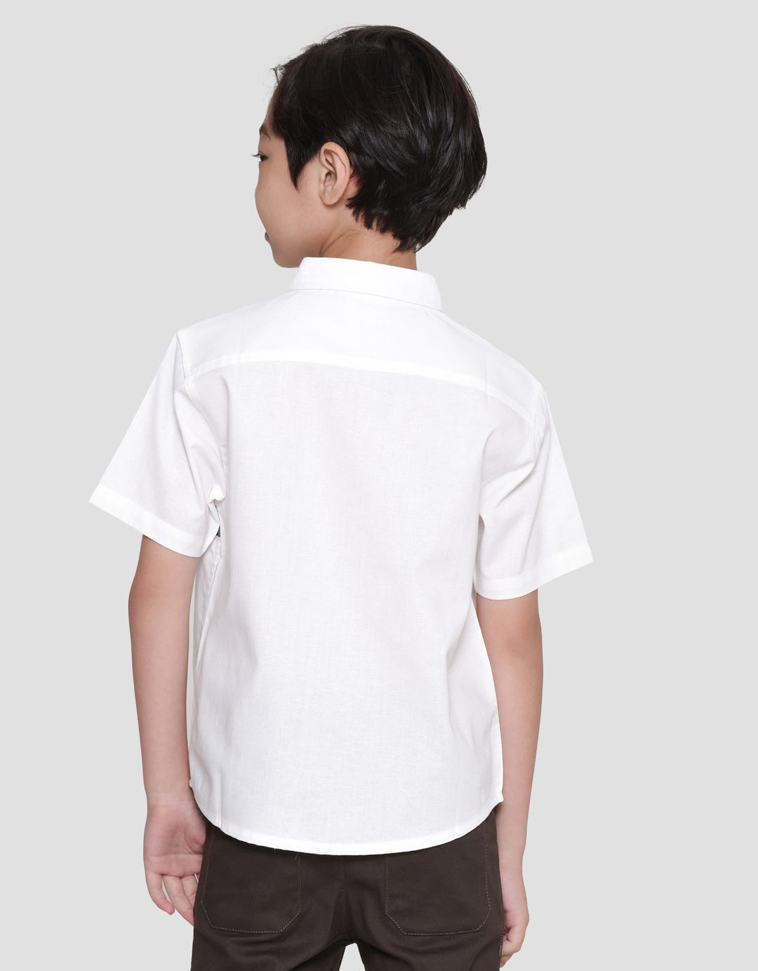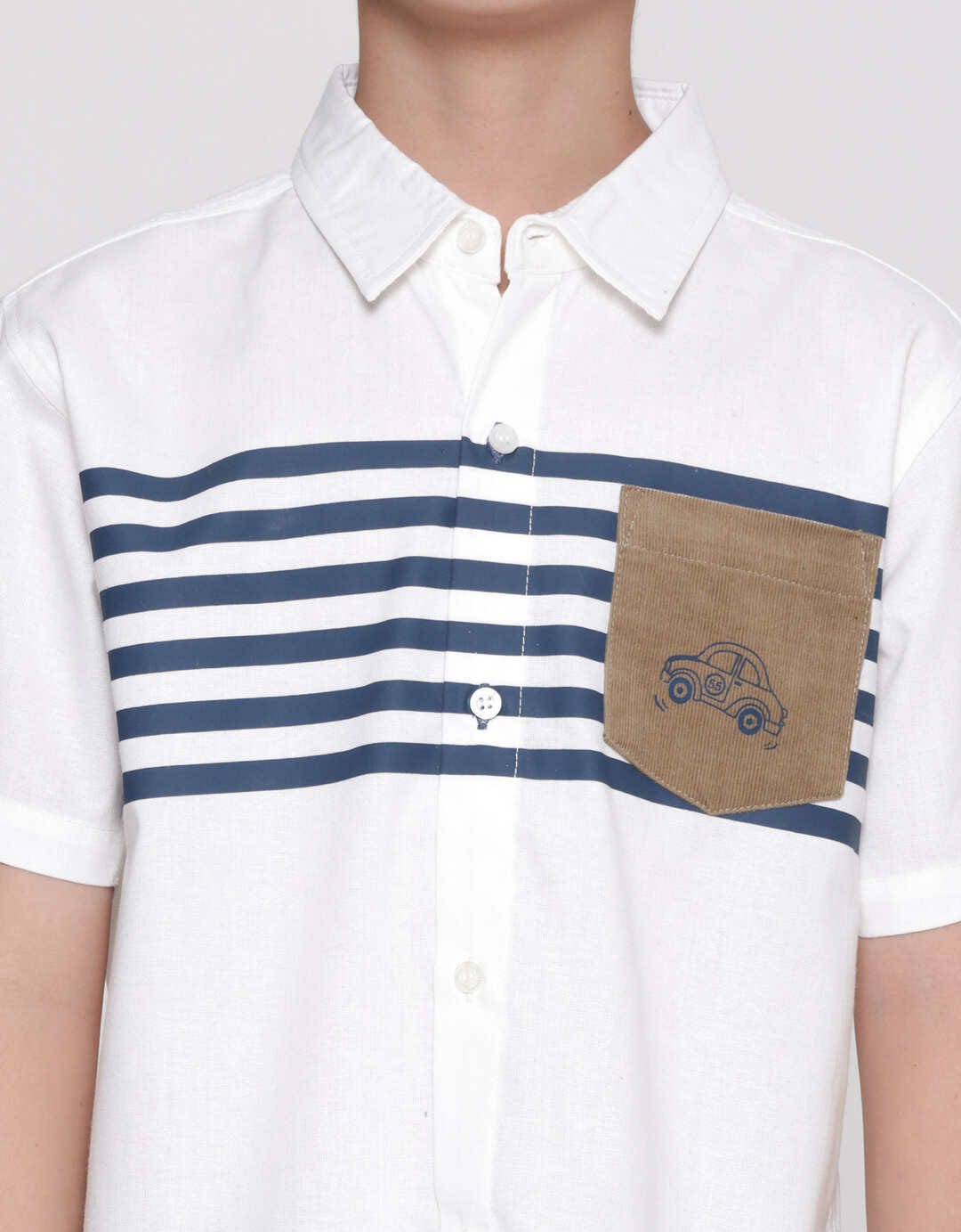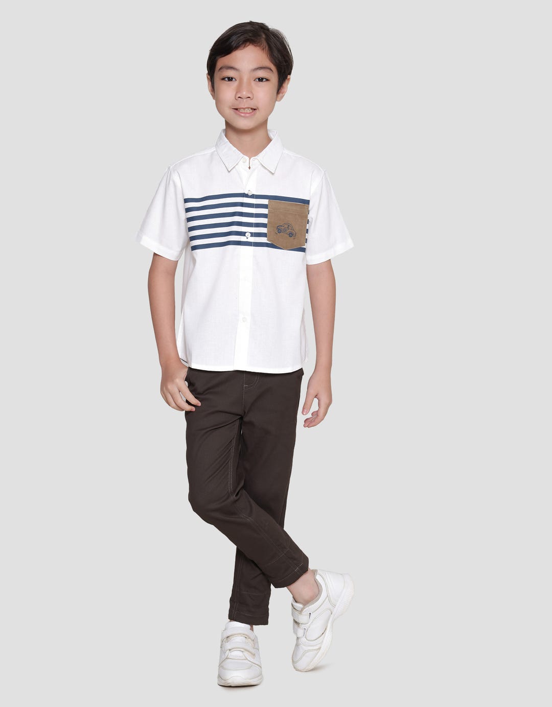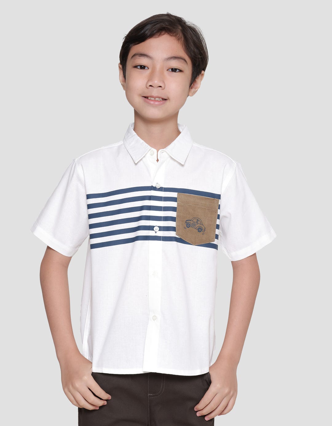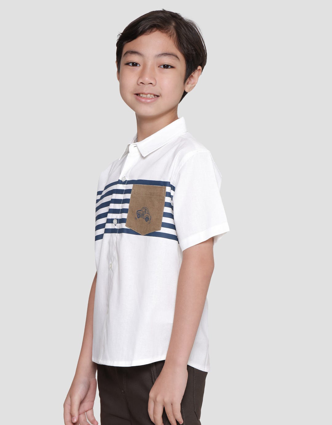Little M Oxford Stripes Kantong Cordoroy Print Kemeja Anak Laki-Laki