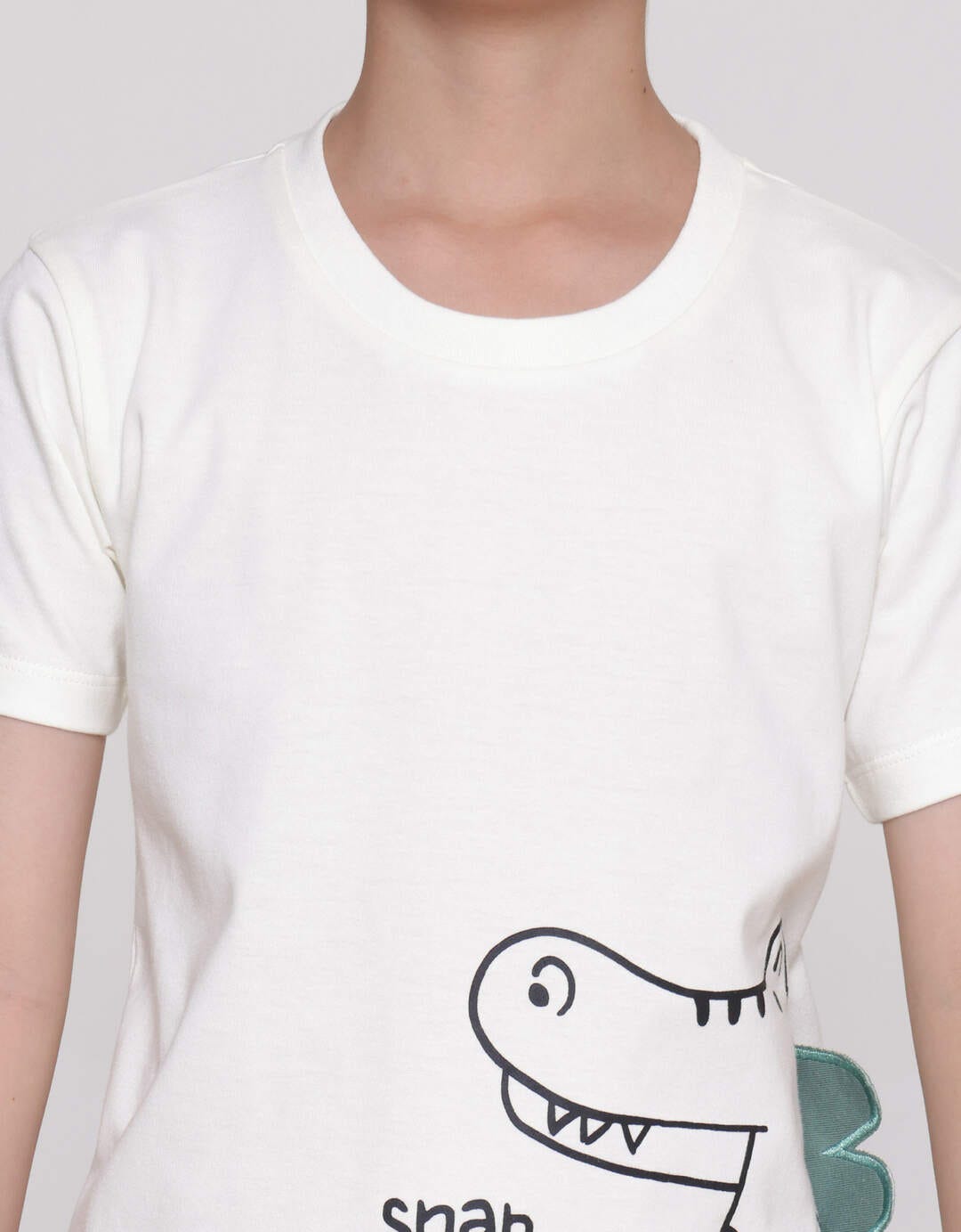 - Detail kerah bulat, lengan pendek