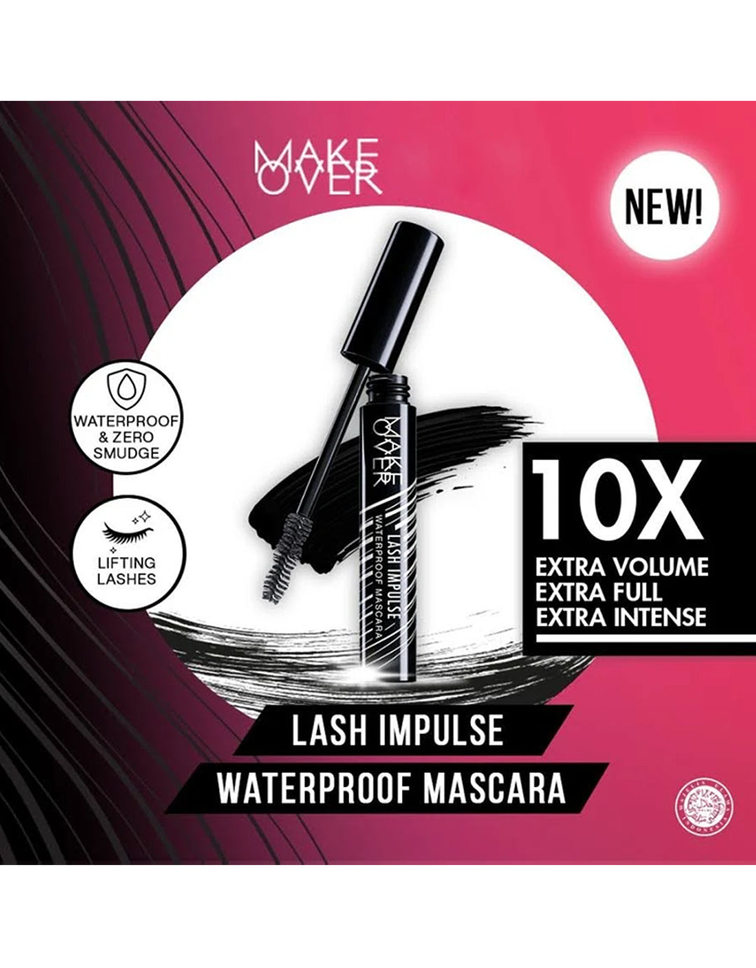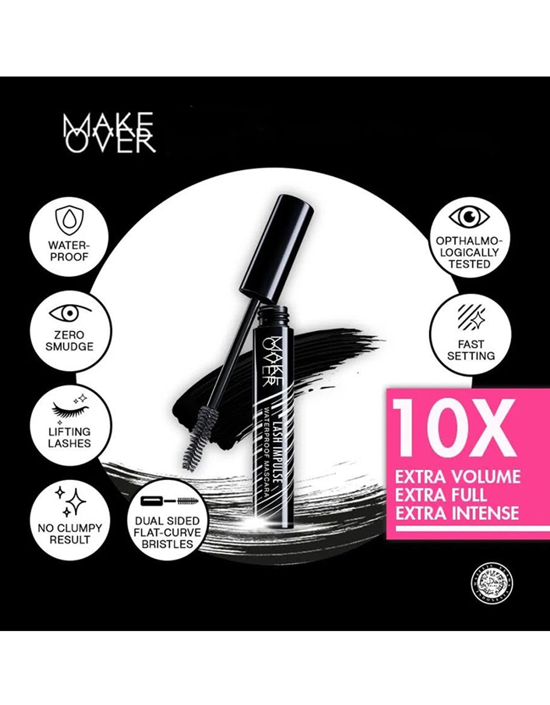 Make Over Lash Impulse Waterproof Mascara adalah maskara tahan air dengan 3D Maxi-Lash Technology yang menghasilkan volume 10x* pada bulu mata anda menjadikannya lebih tebal, lentik, dan lebat. Maskara ini diformulasikan dengan zero-smudge formula yang menjaga performa maskara ini tidak luntur hingga 12 jam. Diinovasikan dengan customize dual sided flat-curve brush yang secara presisi didesain untuk memberikan hasil maksimal tanpa menggumpal. Sisi aplikator yang rata untuk mengisi volume pada bulu mata dan sisi aplikator yang berlekuk untuk menjangkau dan meratakan maskara untuk hasil yang tidak menggumpal. Dermatologically tested & ophthalmologist tested.