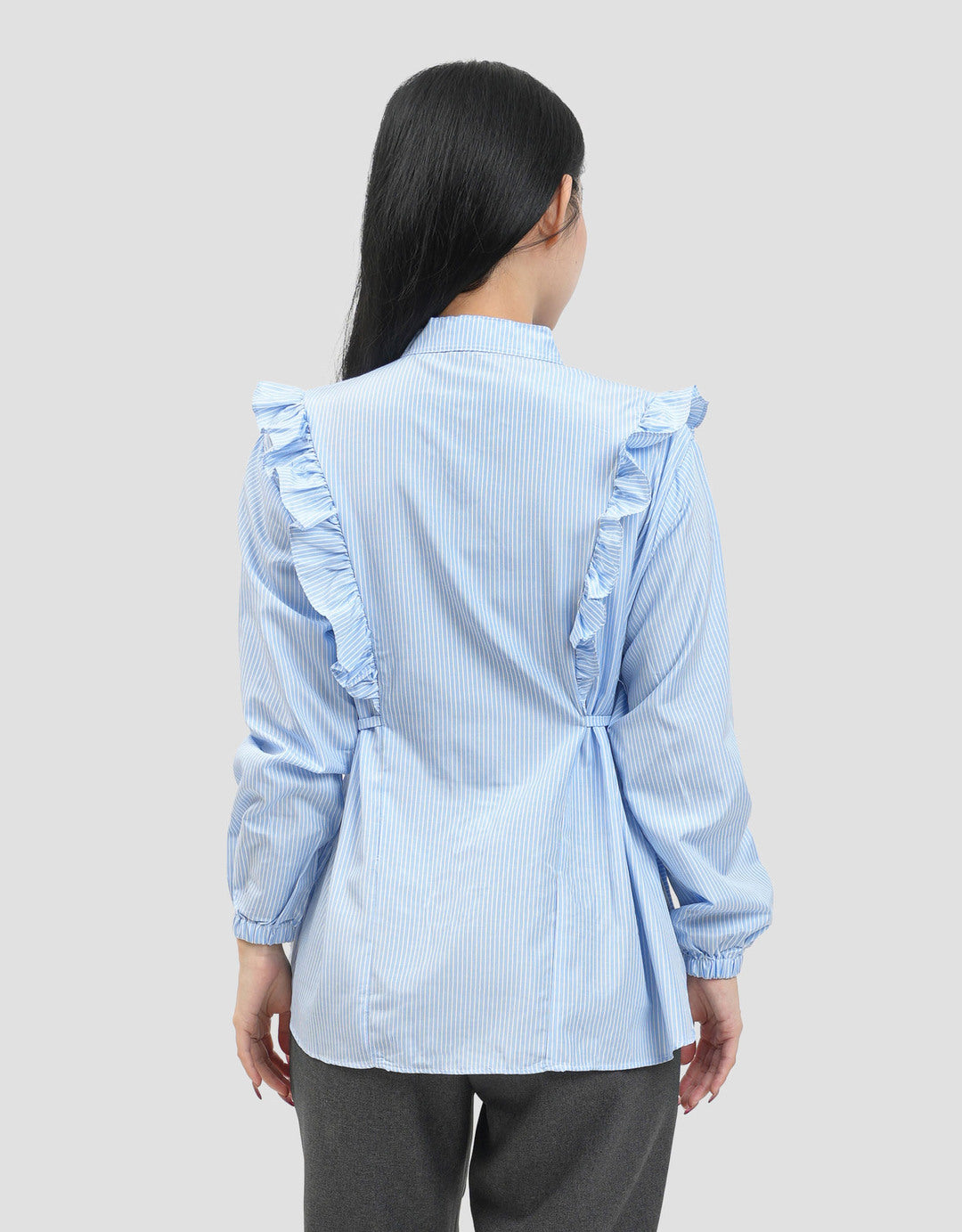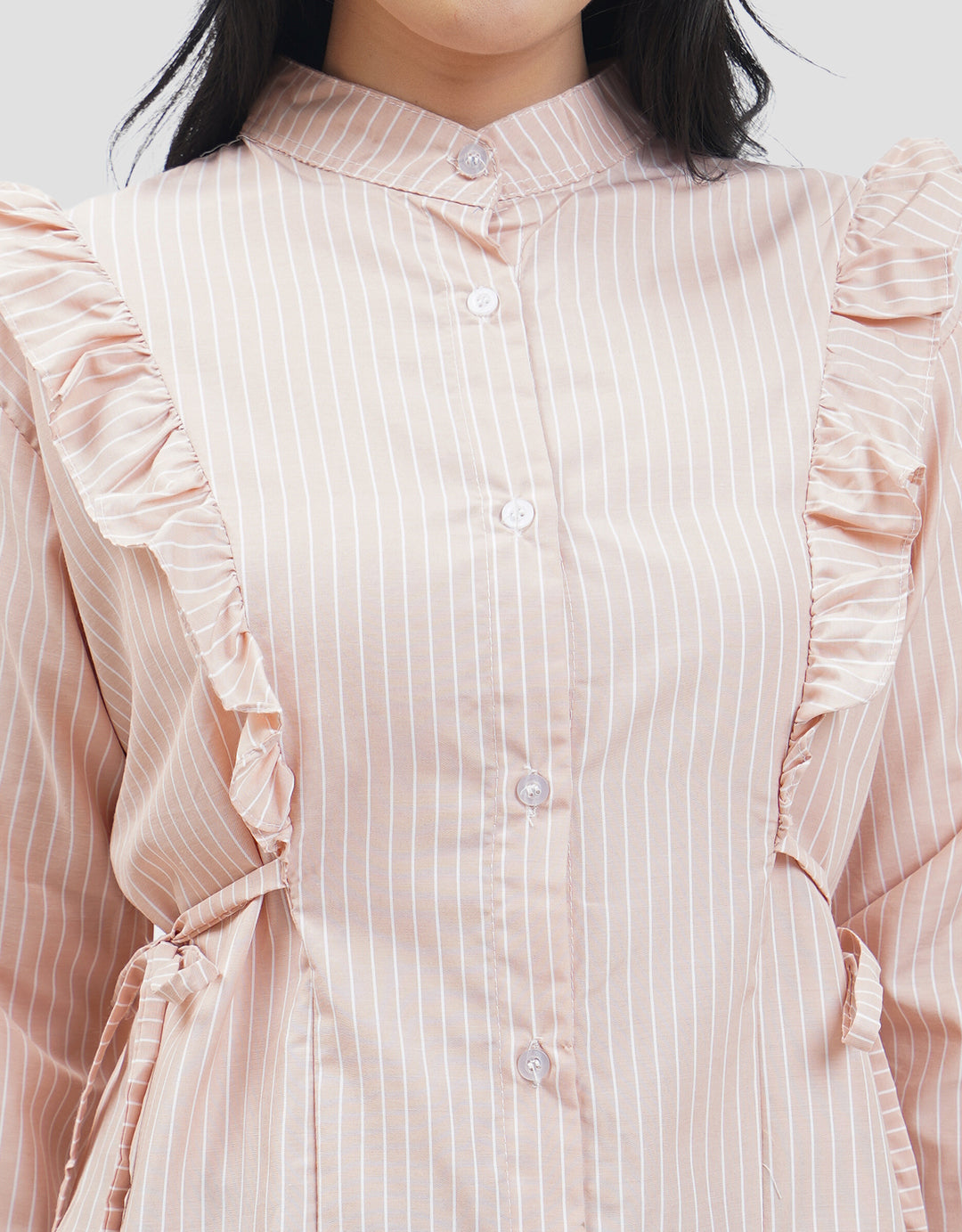 Kemeja fashion wanita ini hadir dengan desain elegan yang dilengkapi dengan detail ruffle pada bagian bahu yang memberikan sentuhan feminin dan stylish. Model kerah berdiri dengan kancing depan membuat tampilan terlihat rapi dan modern.