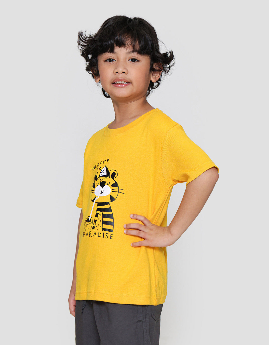 Kaos anak laki-laki dengan design yang simple dan casual, cocok untuk digunakan anak pada moment berharga mereka untuk menunjang penampilan anak menjadi lebih menawan.
