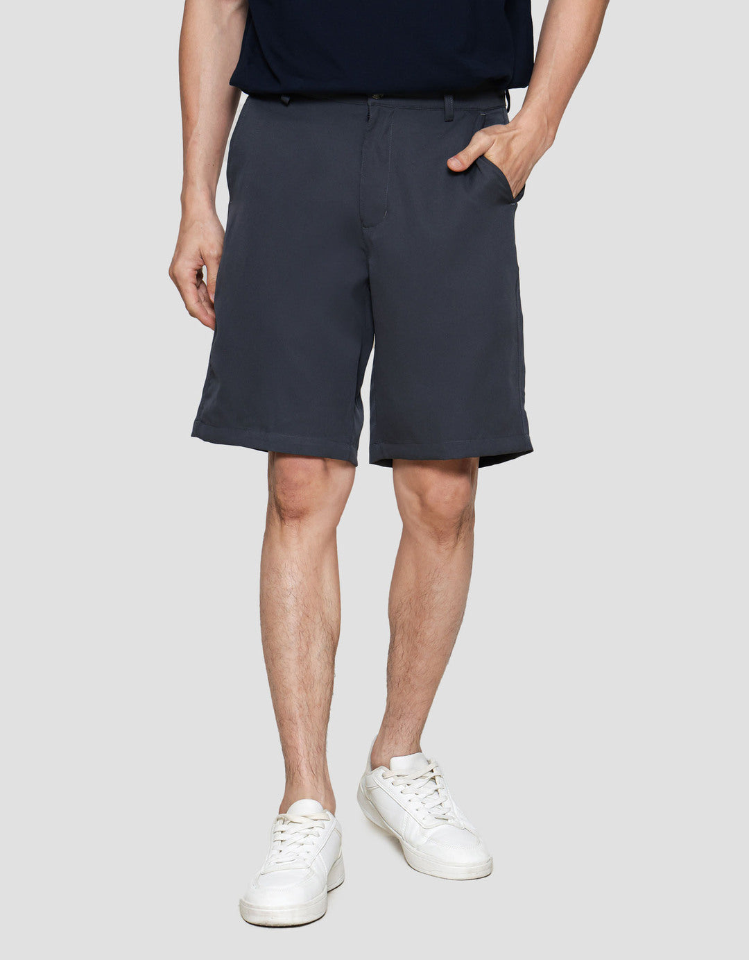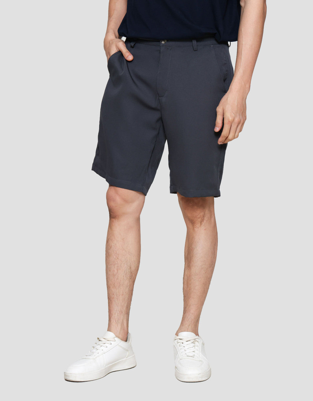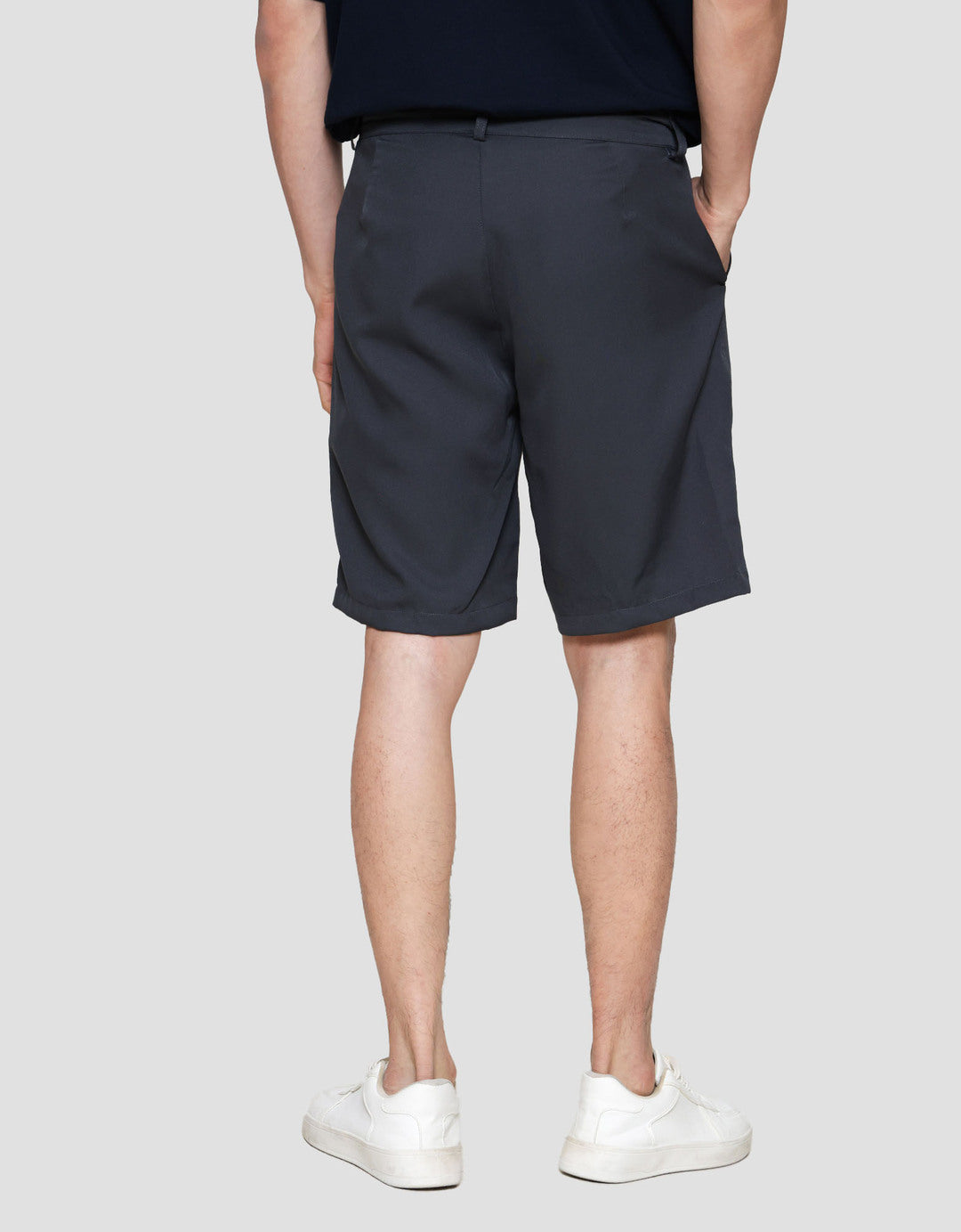 - Detail kancing dan resleting depan, belt loops, kantong