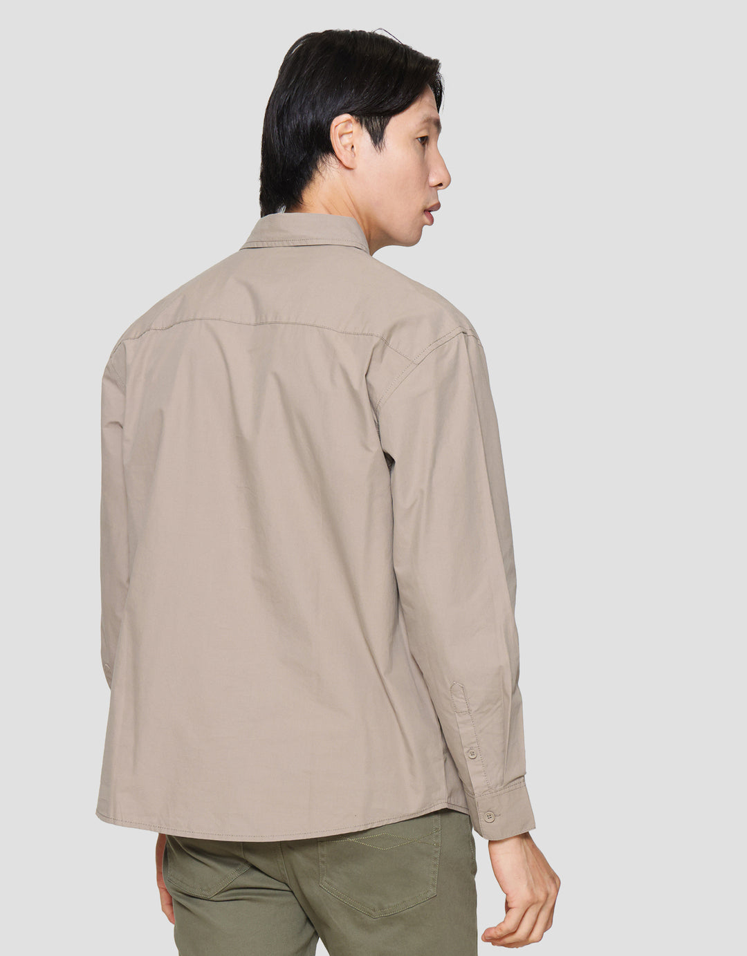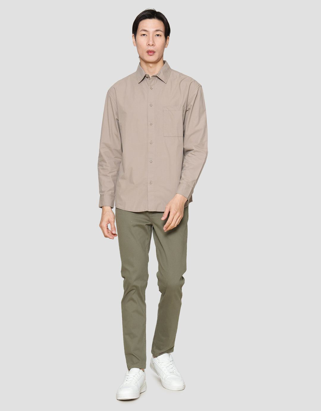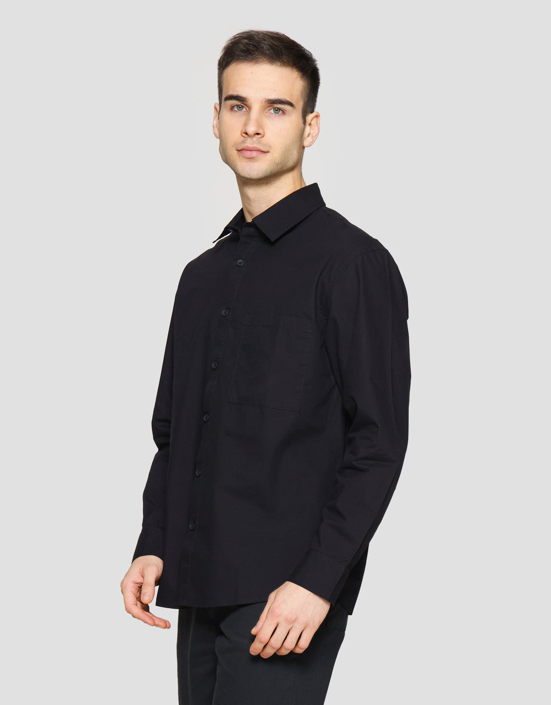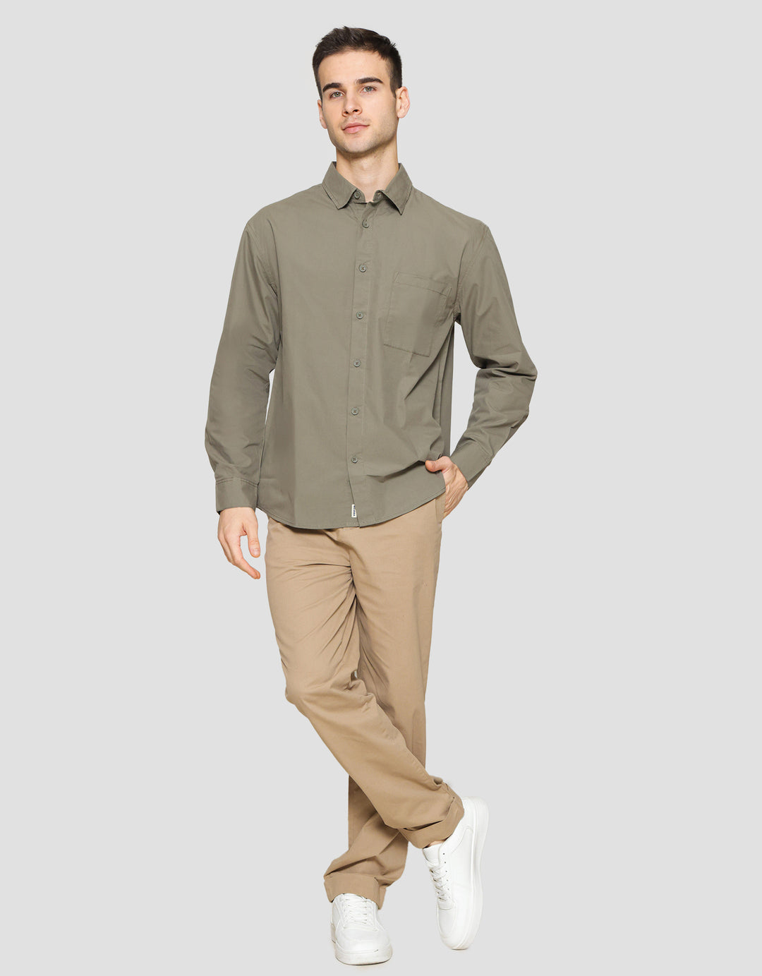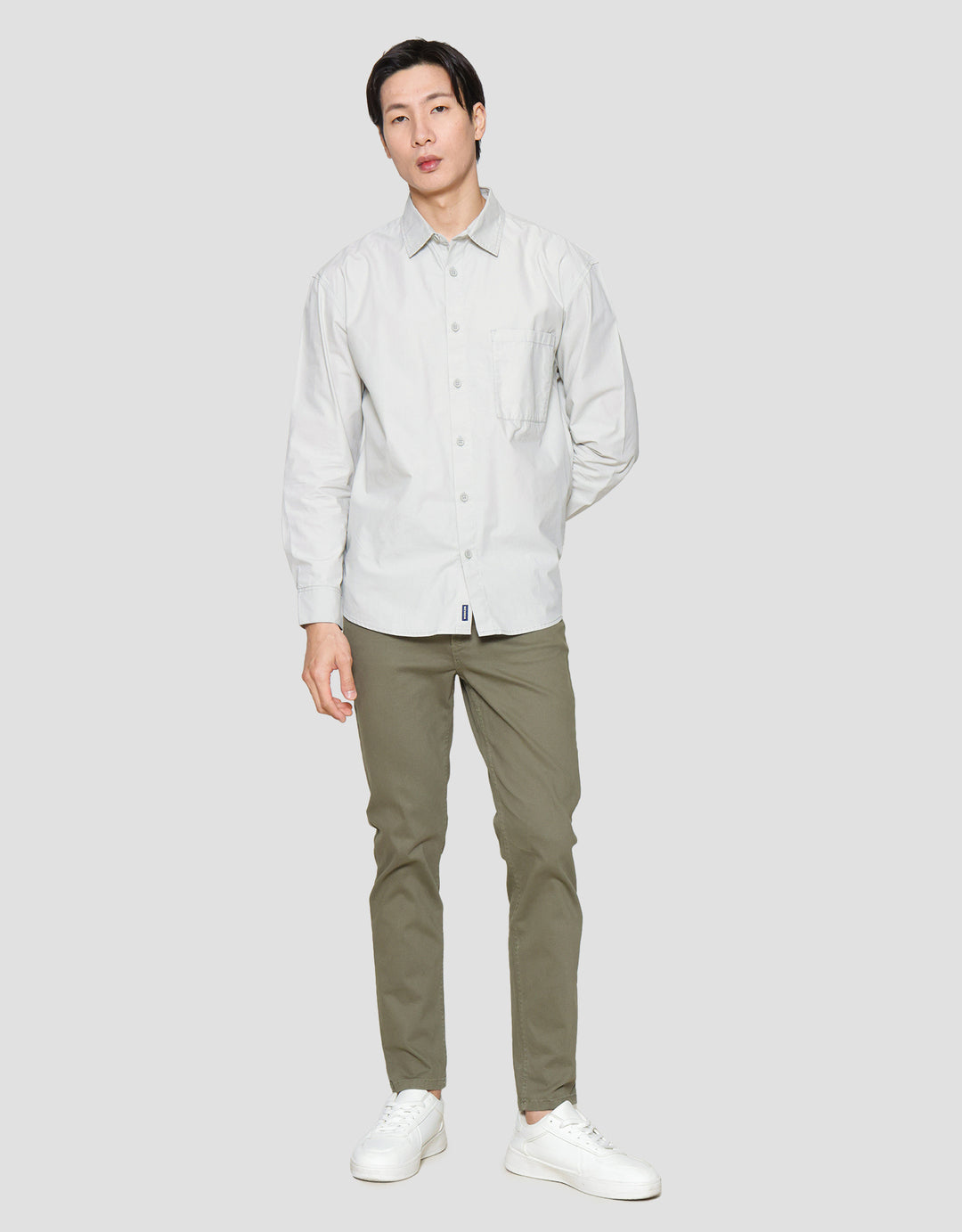 - Detail kerah regular, kancing dan saku depan, lengan panjang