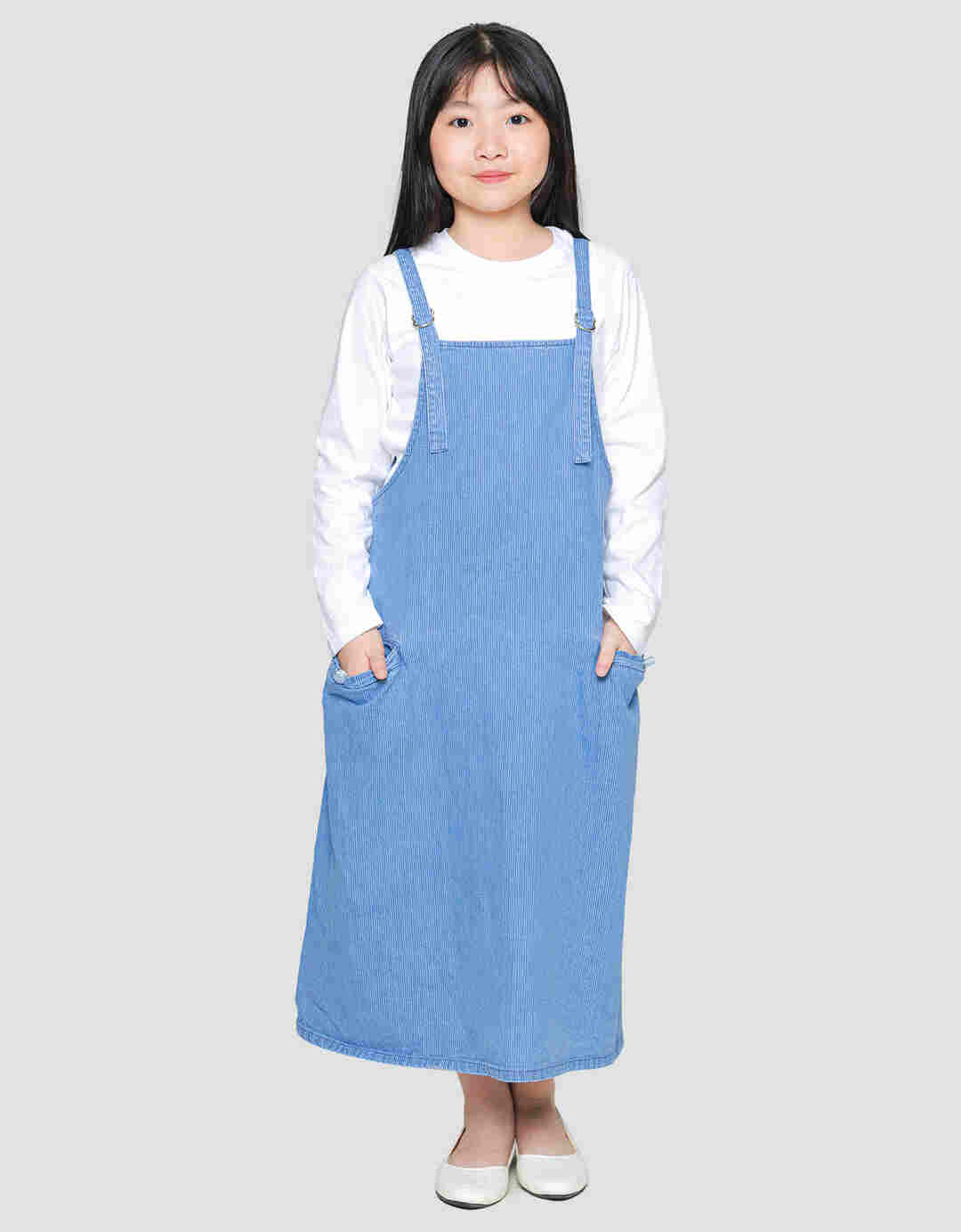 Nevada Salur Kantong Kerut Midi Dress Overall Denim Anak Perempuan