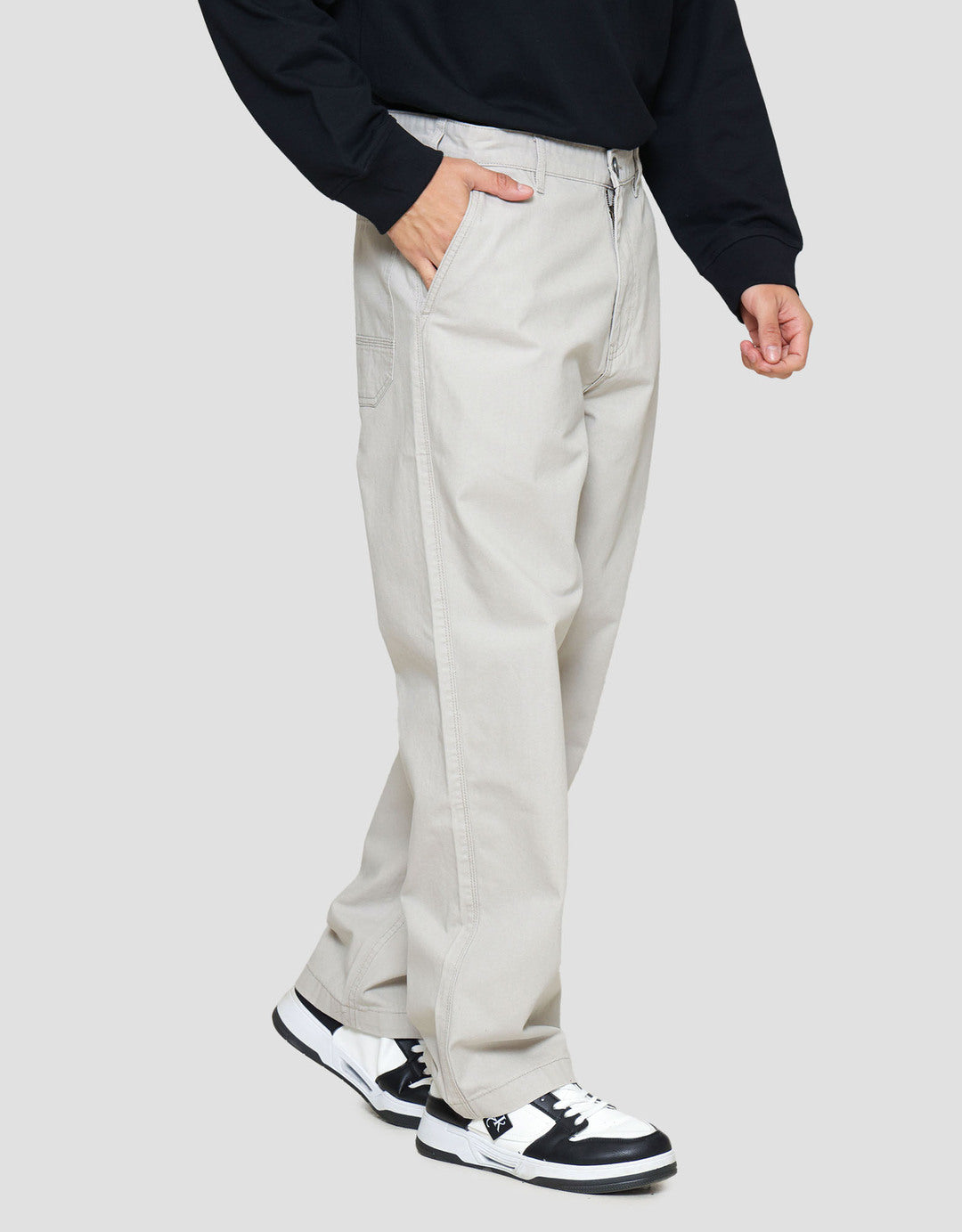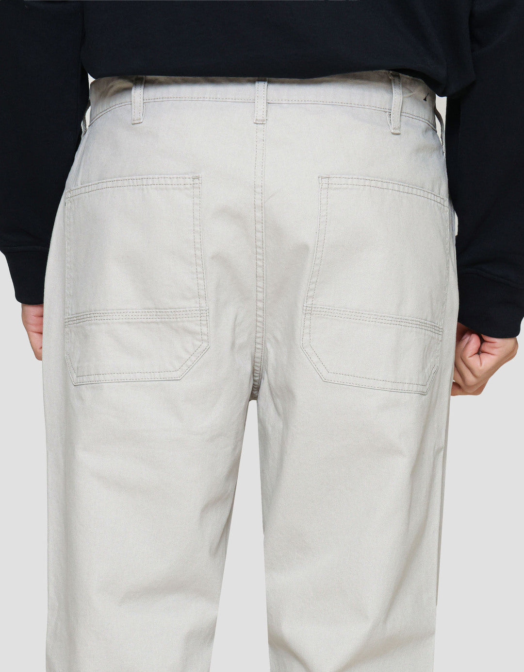 - Detail kancing dan resleting depan, belt loops, kantong