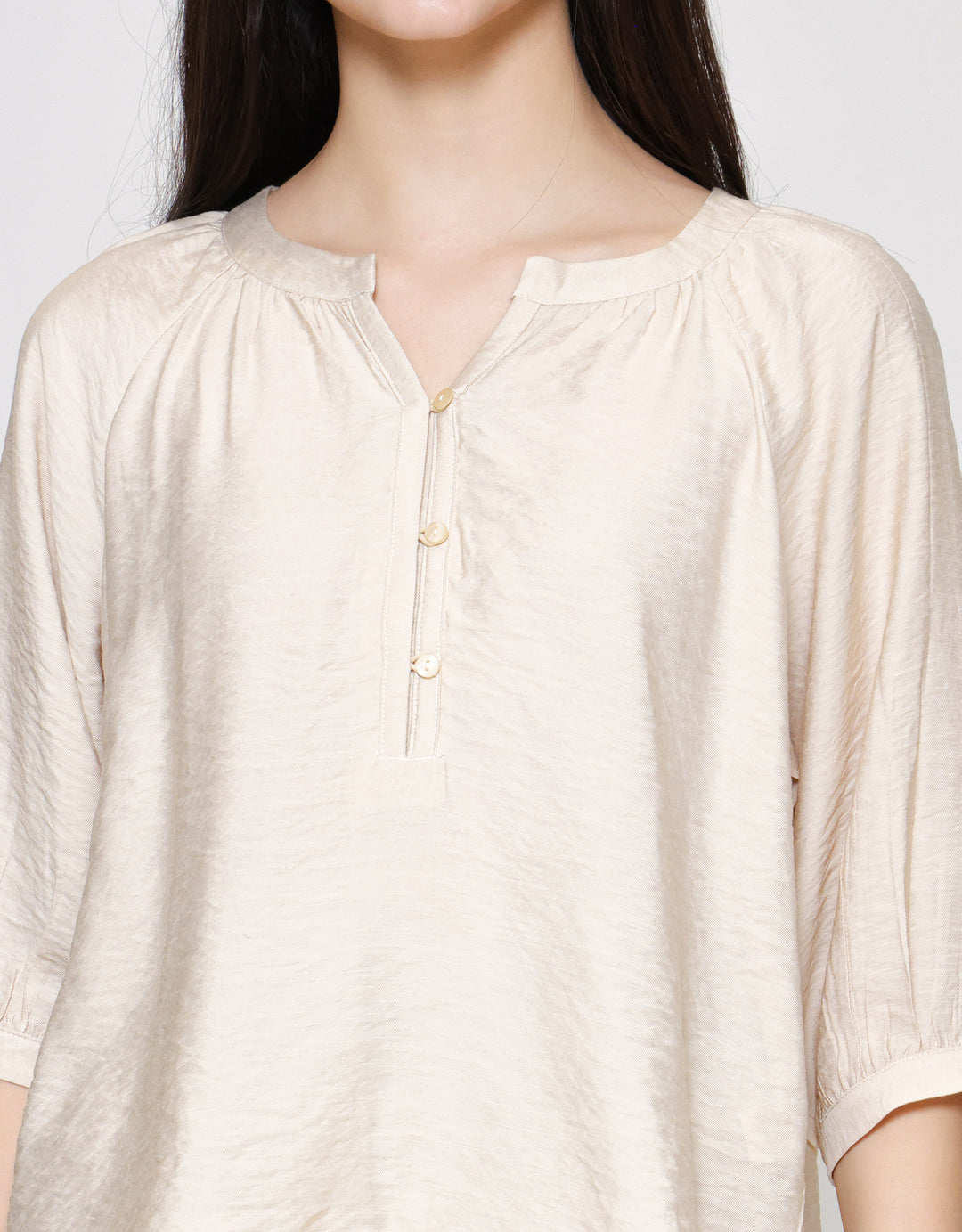 S. Yves Textured Silicone Silk Buttoned V Neck Blouse Wanita