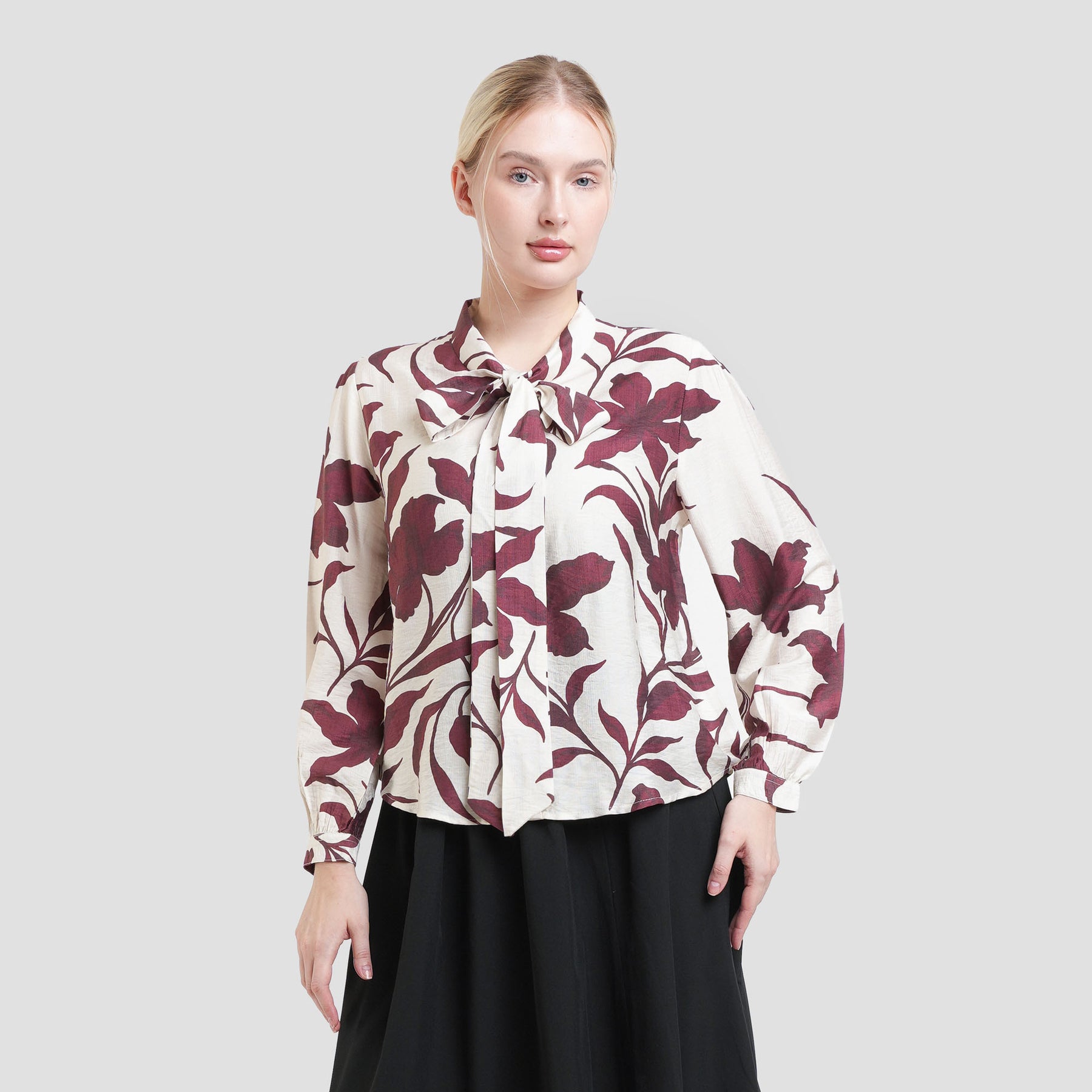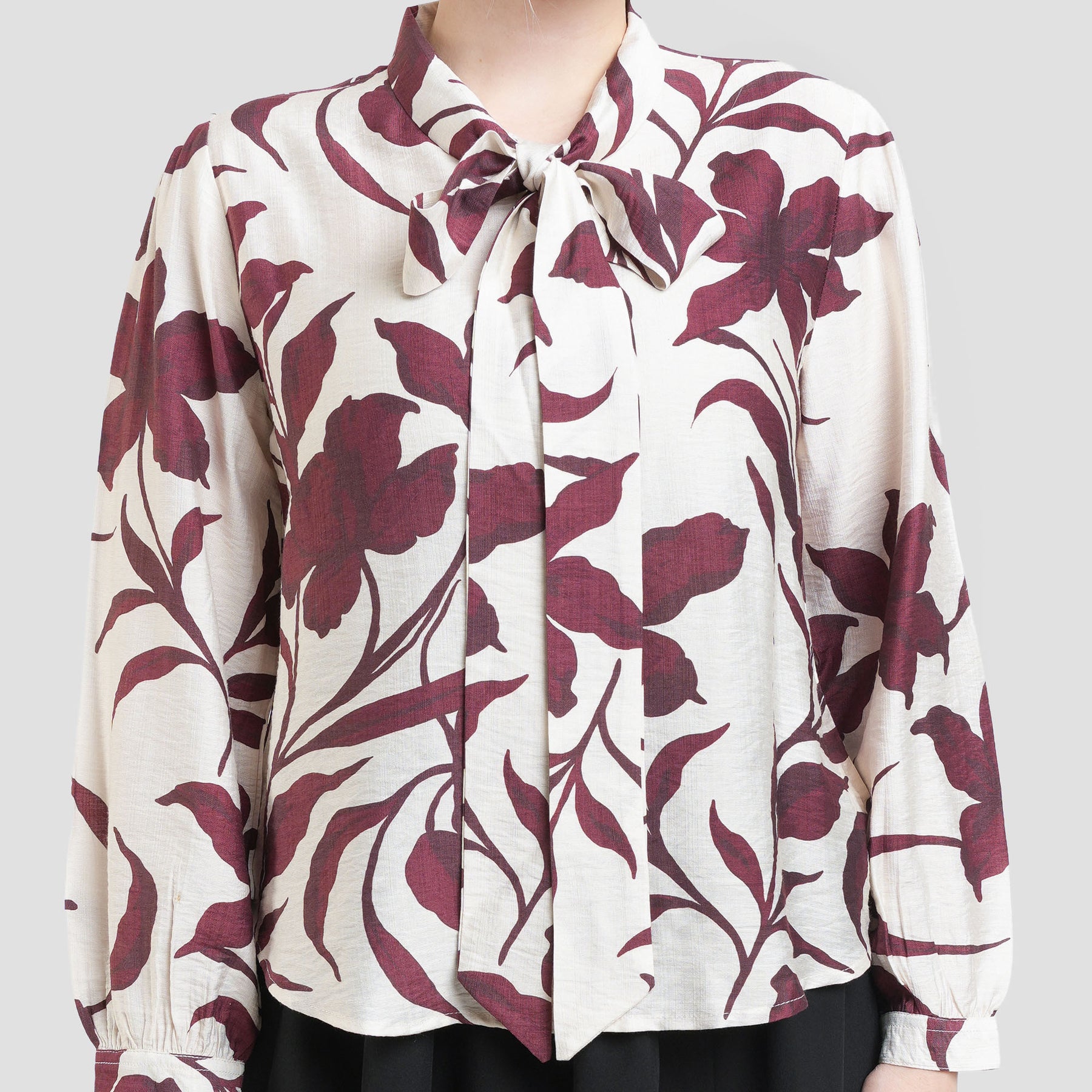 St. Yves Big Leaf Print With Ribbon Neck Blouse Wanita