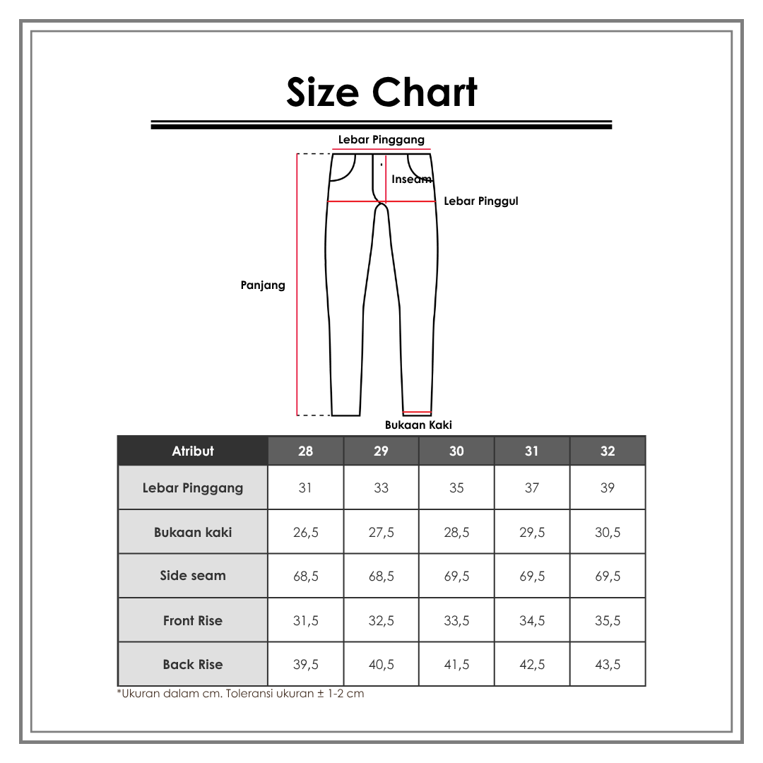Size Chart (Lebar Pinggang Elastis X Lebar Paha X Front Rise X Back Rise X Outseam X Bawah X Lebar Pinggul)