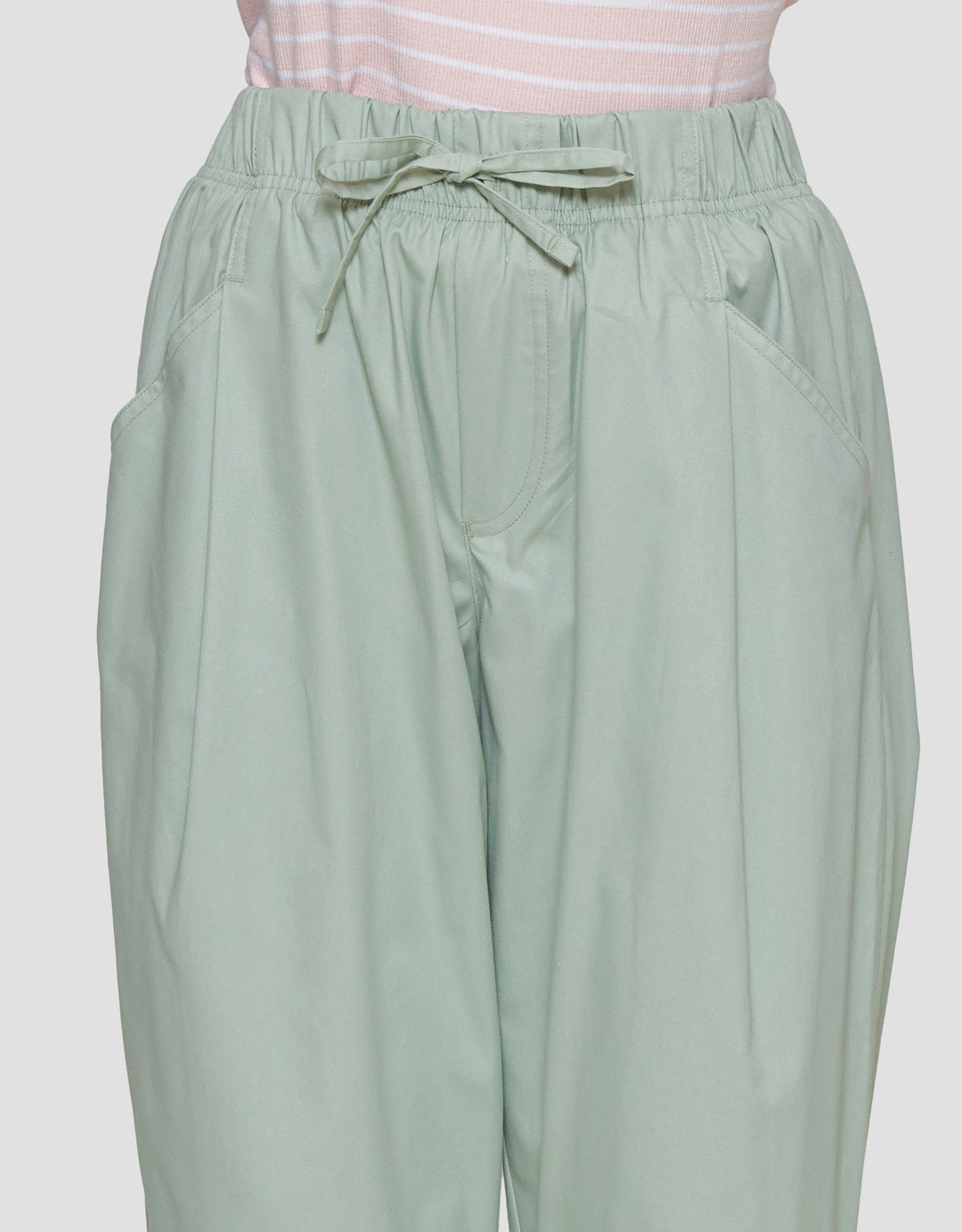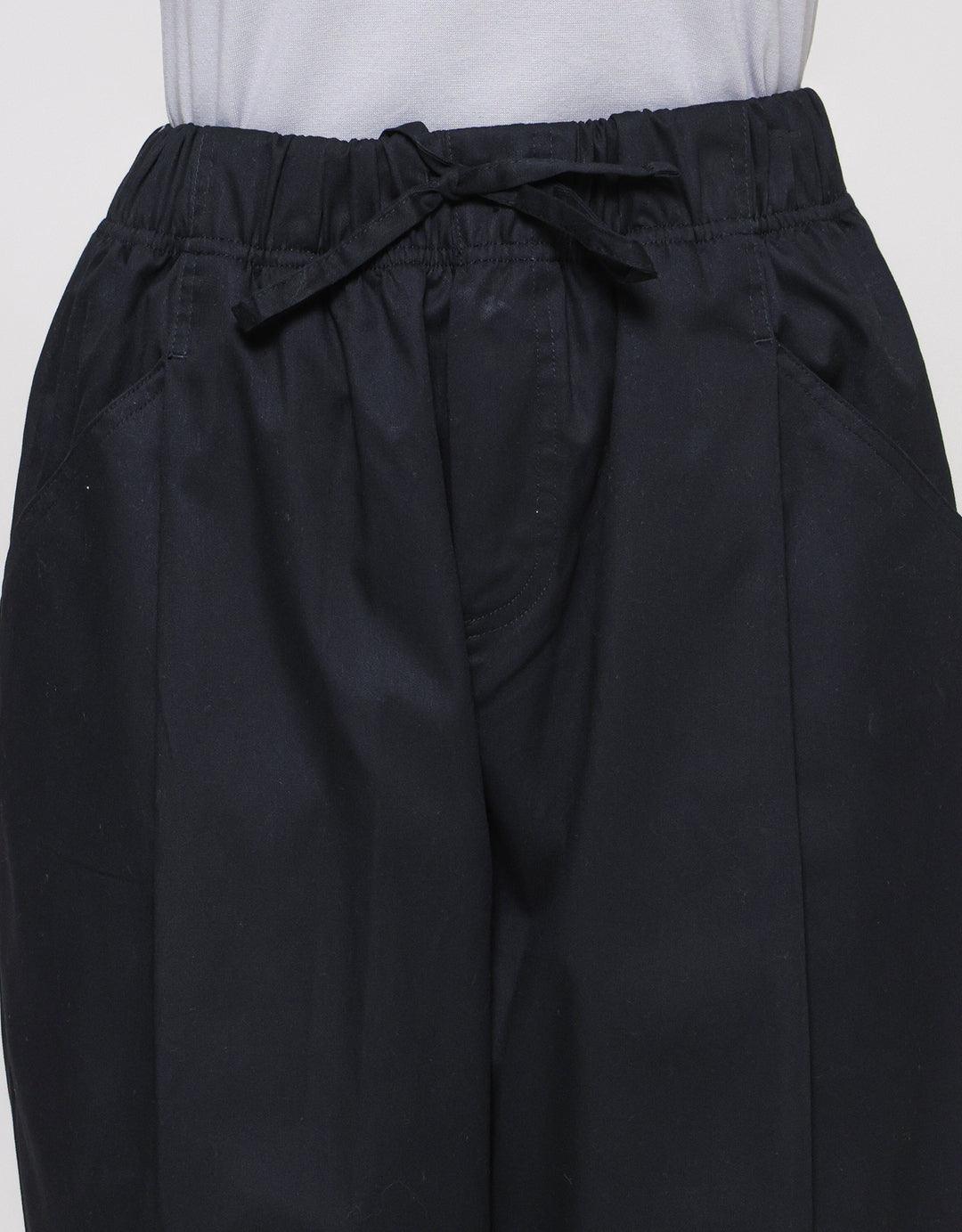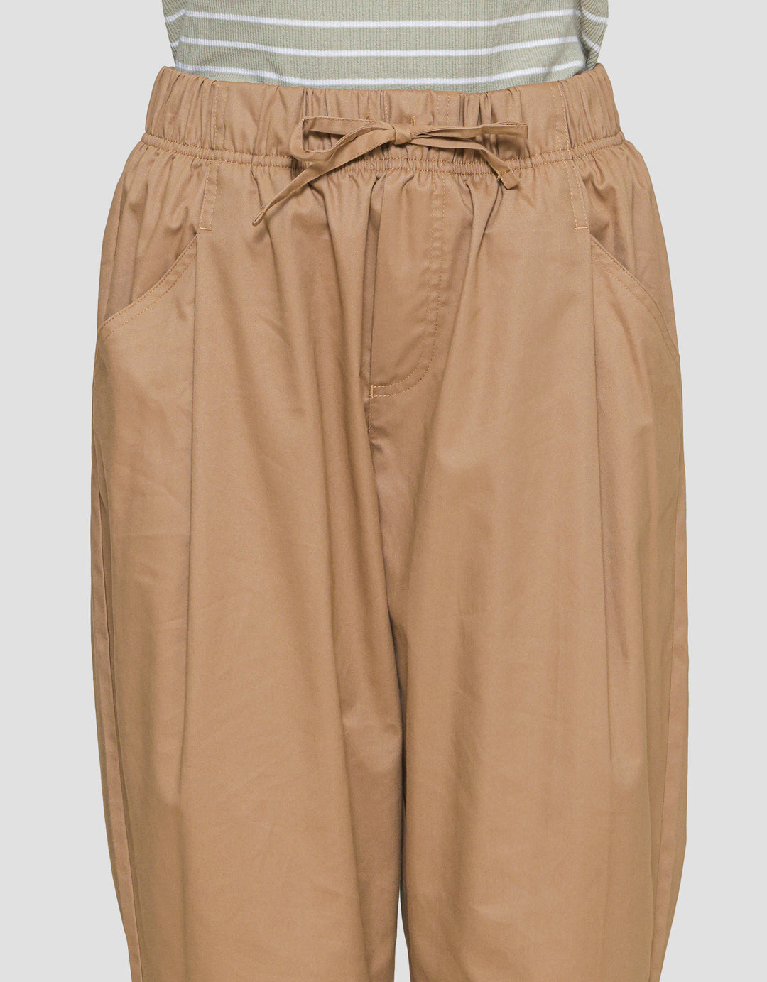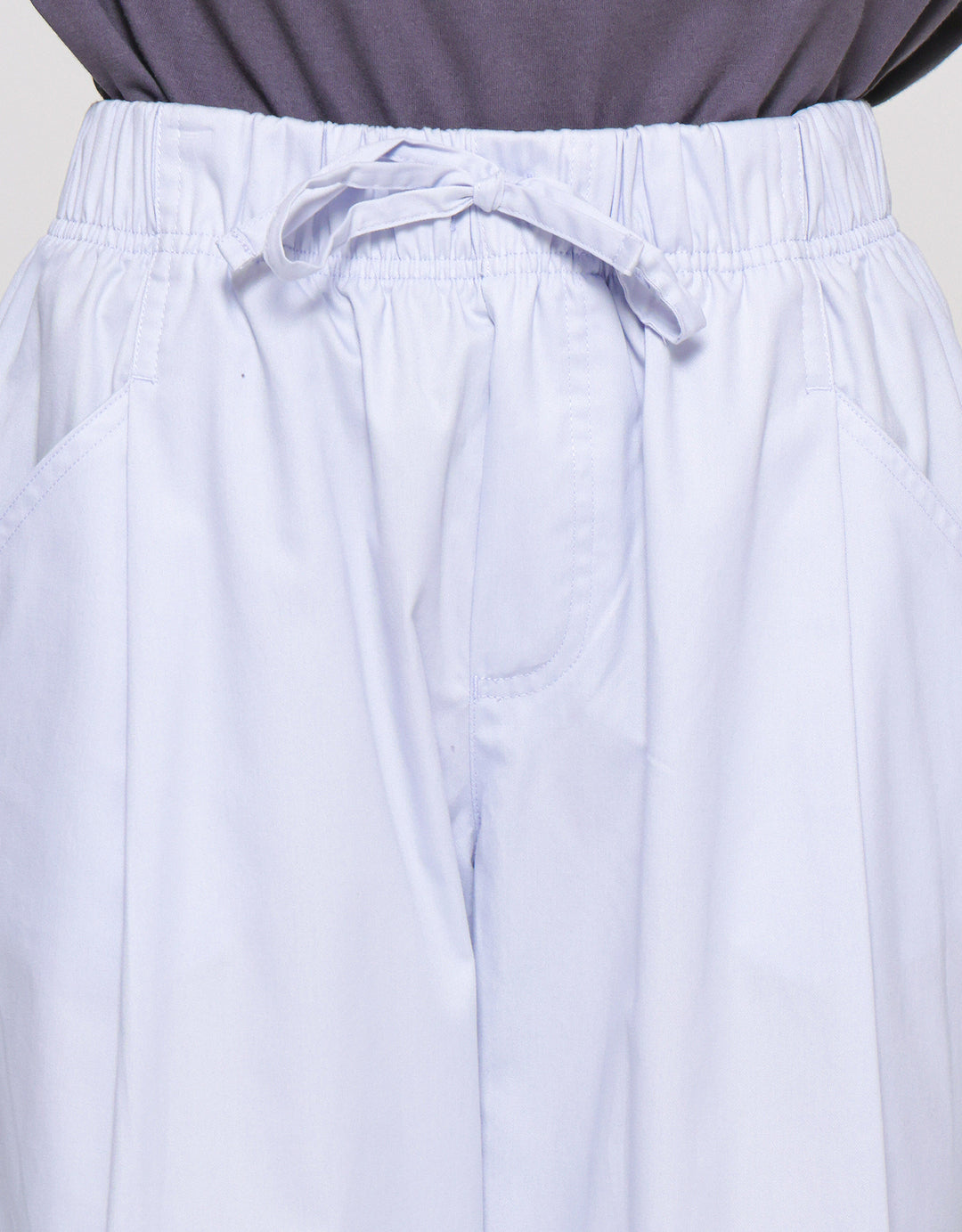 - Detail karet pinggang dengan tali pita, kantong