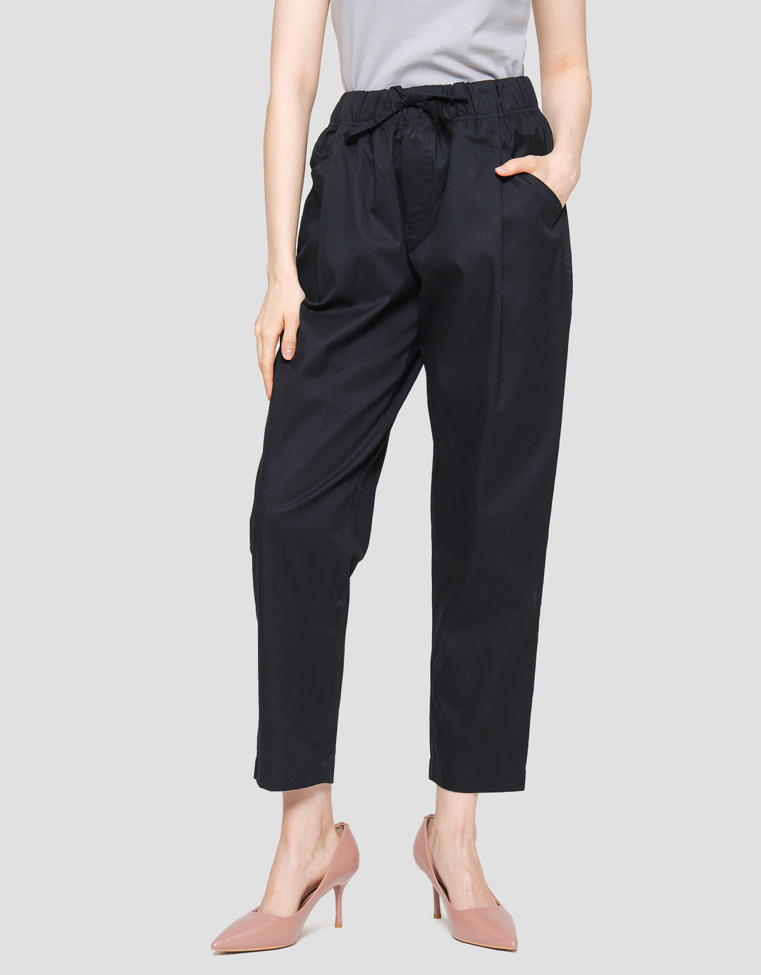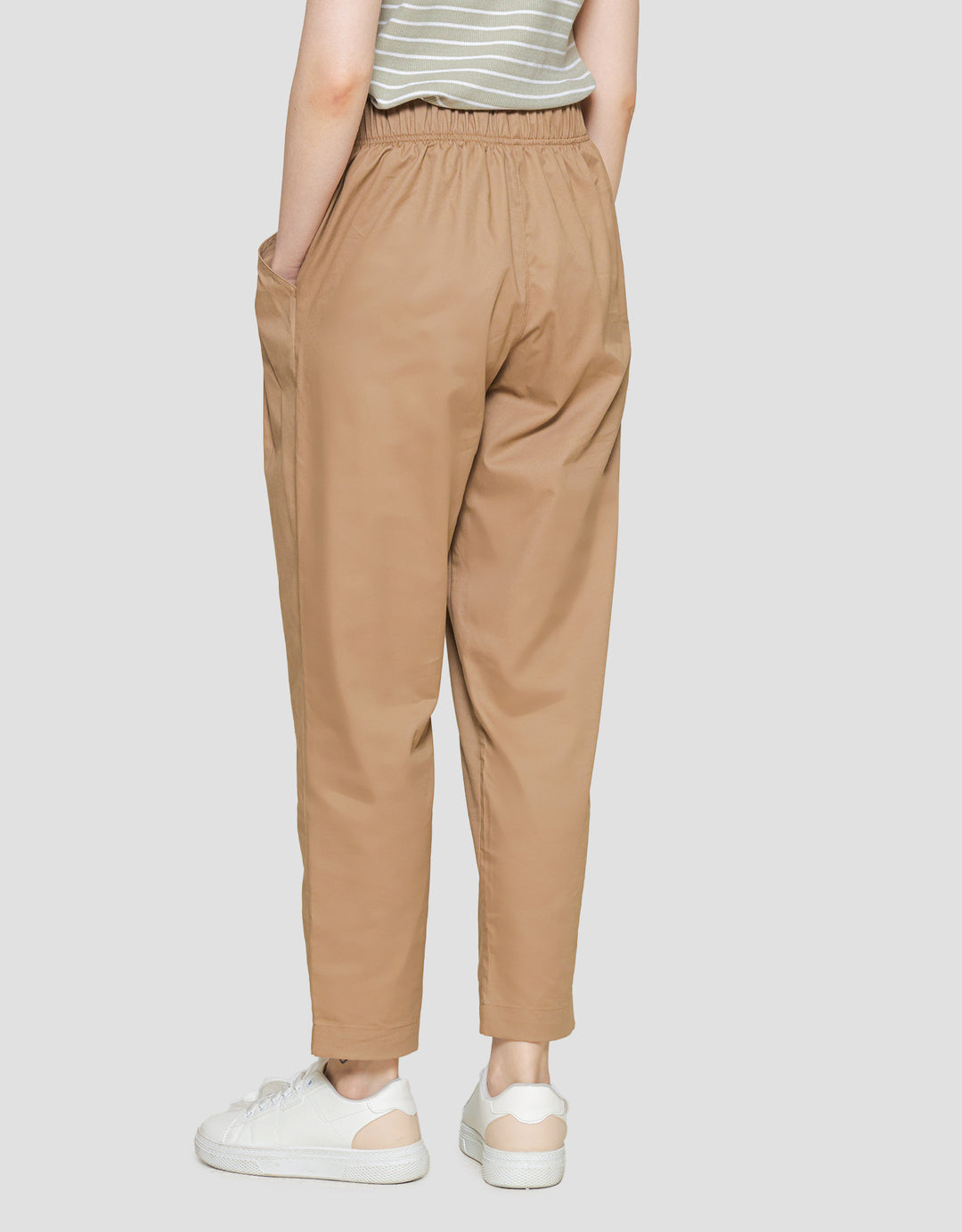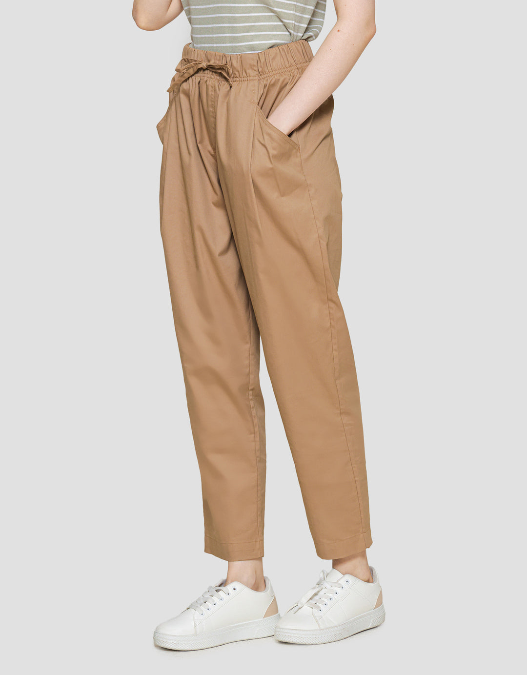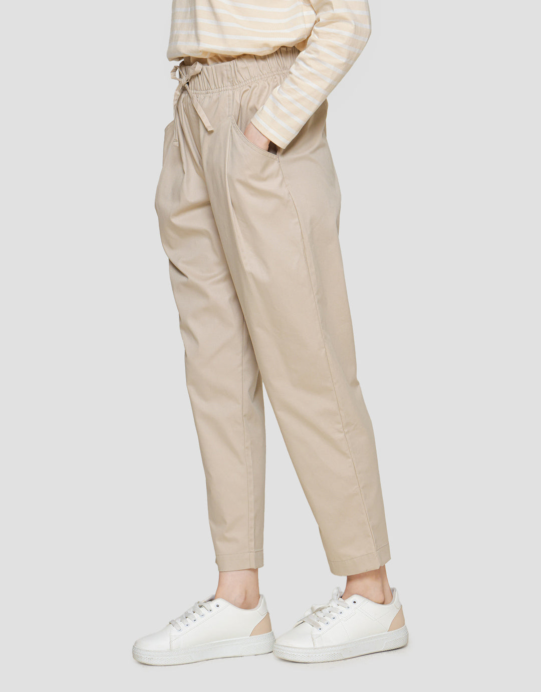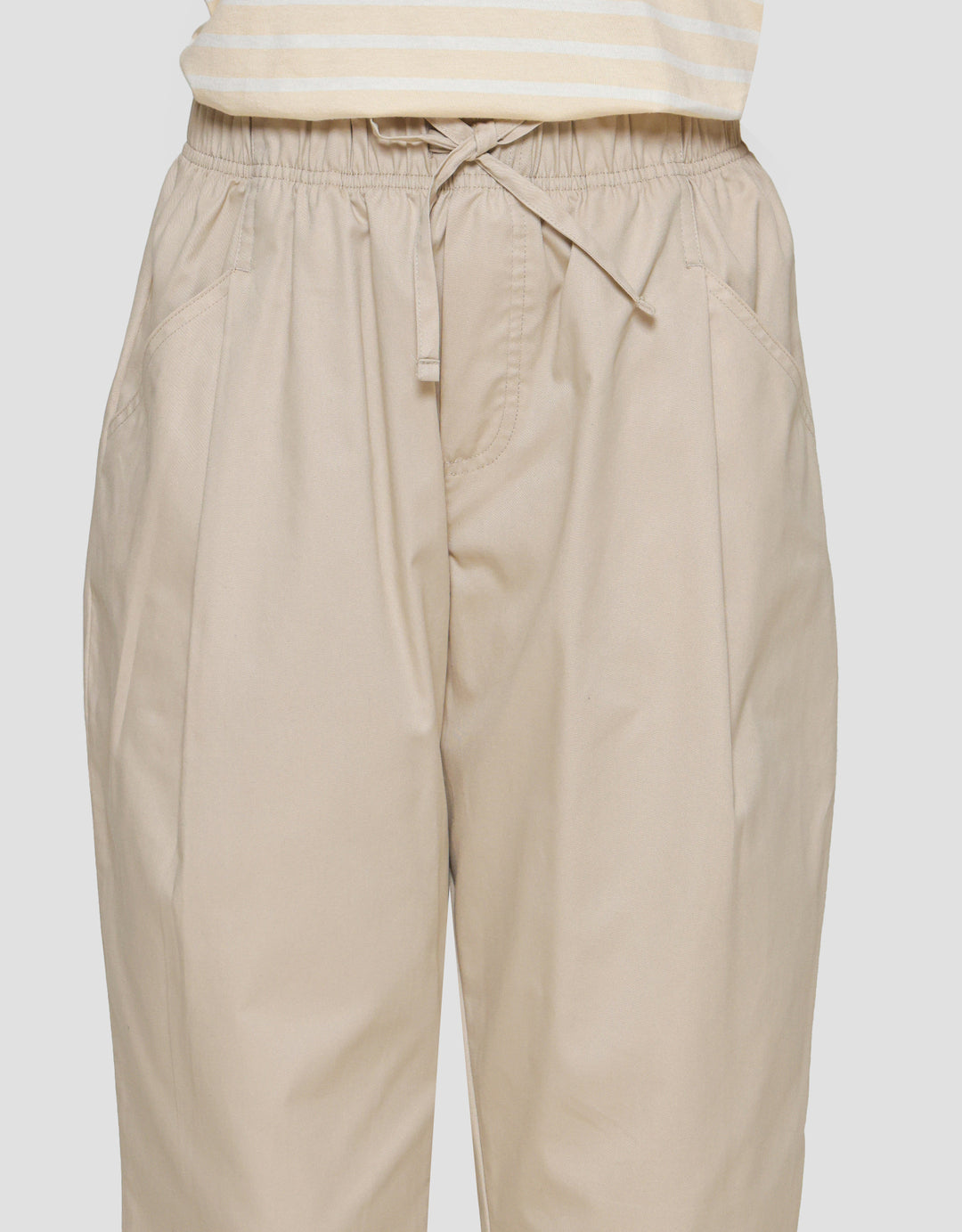 - Detail karet pinggang dengan tali pita, kantong