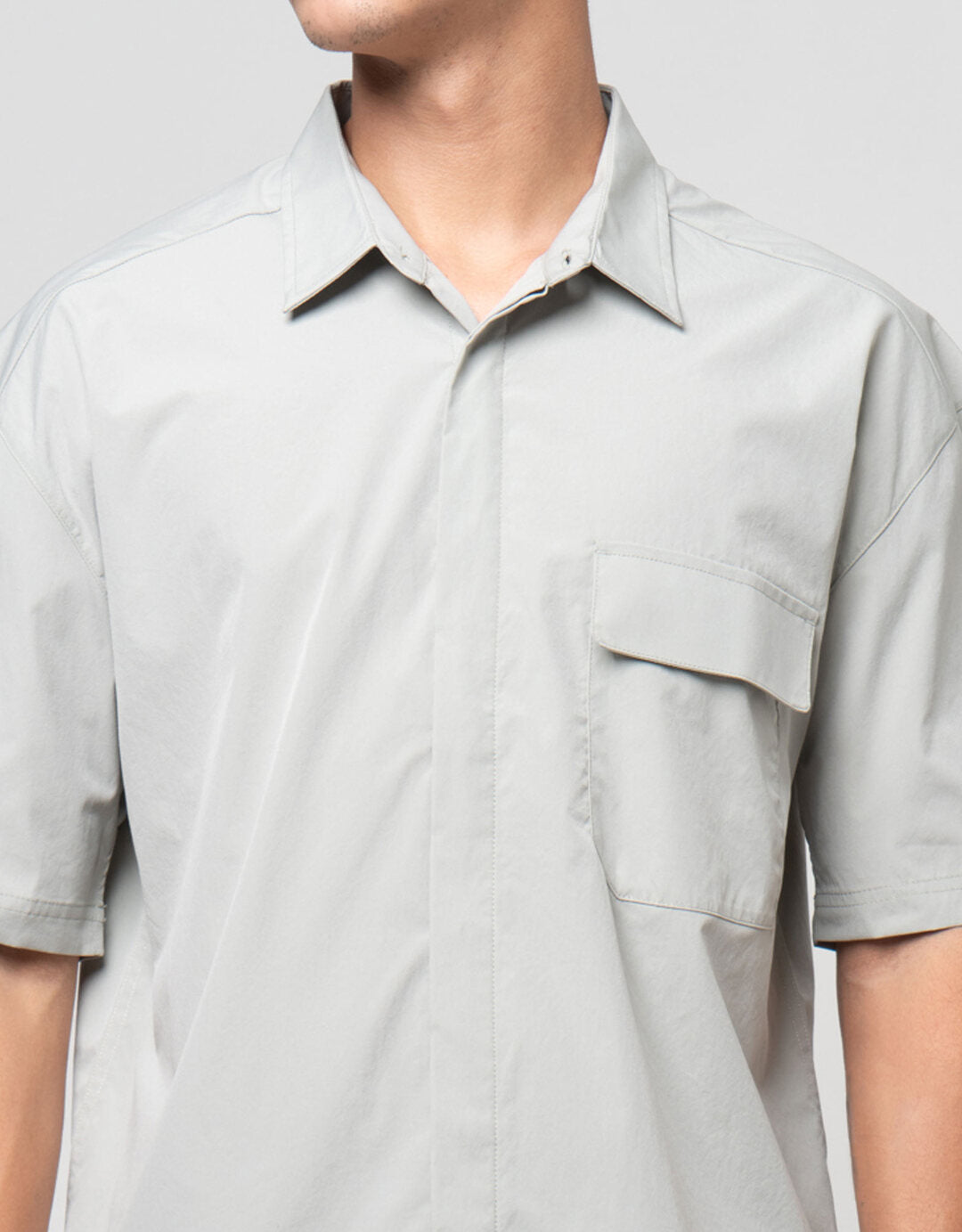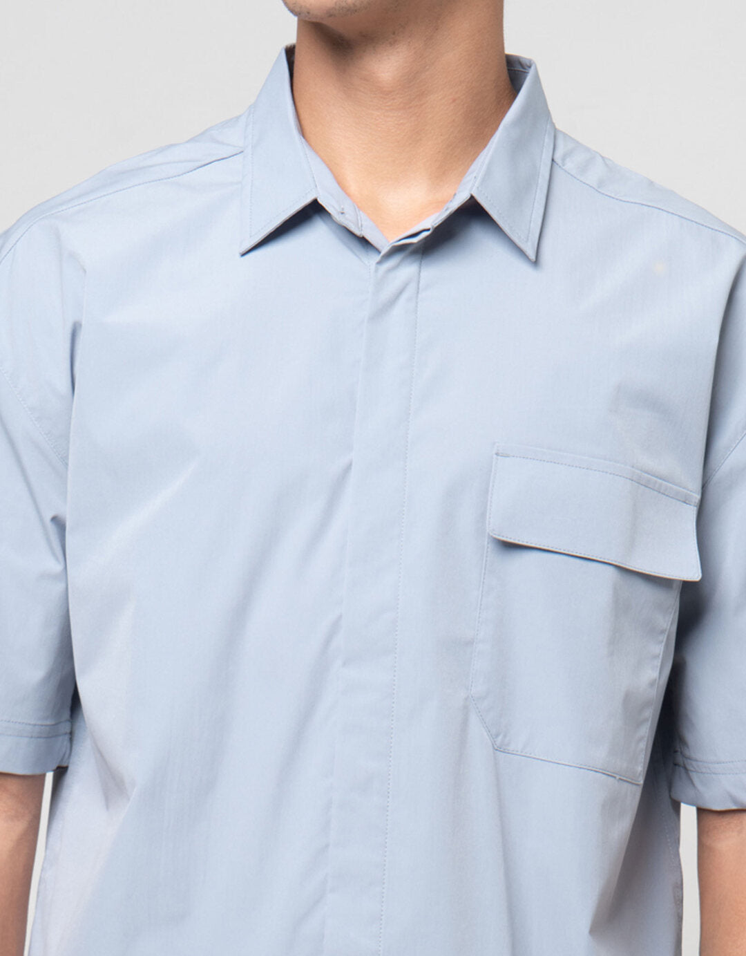 • Detail kancing depan, kerah, lengan pendek