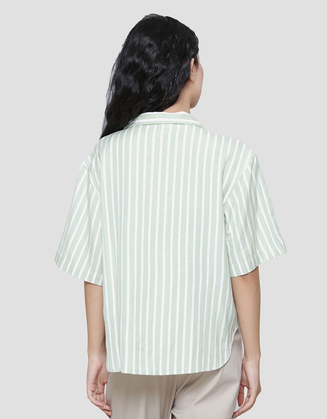 Suko Striped Rayon Linen Kerah Terbuka Kemeja Lengan Pendek Wanita