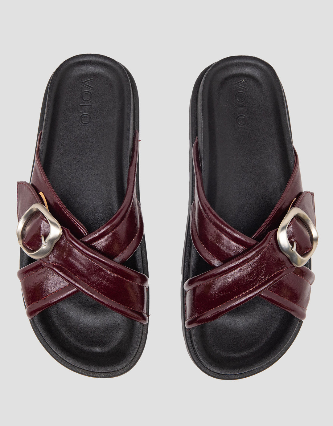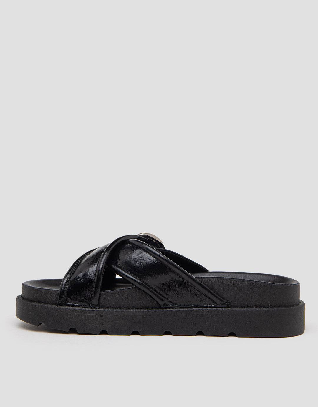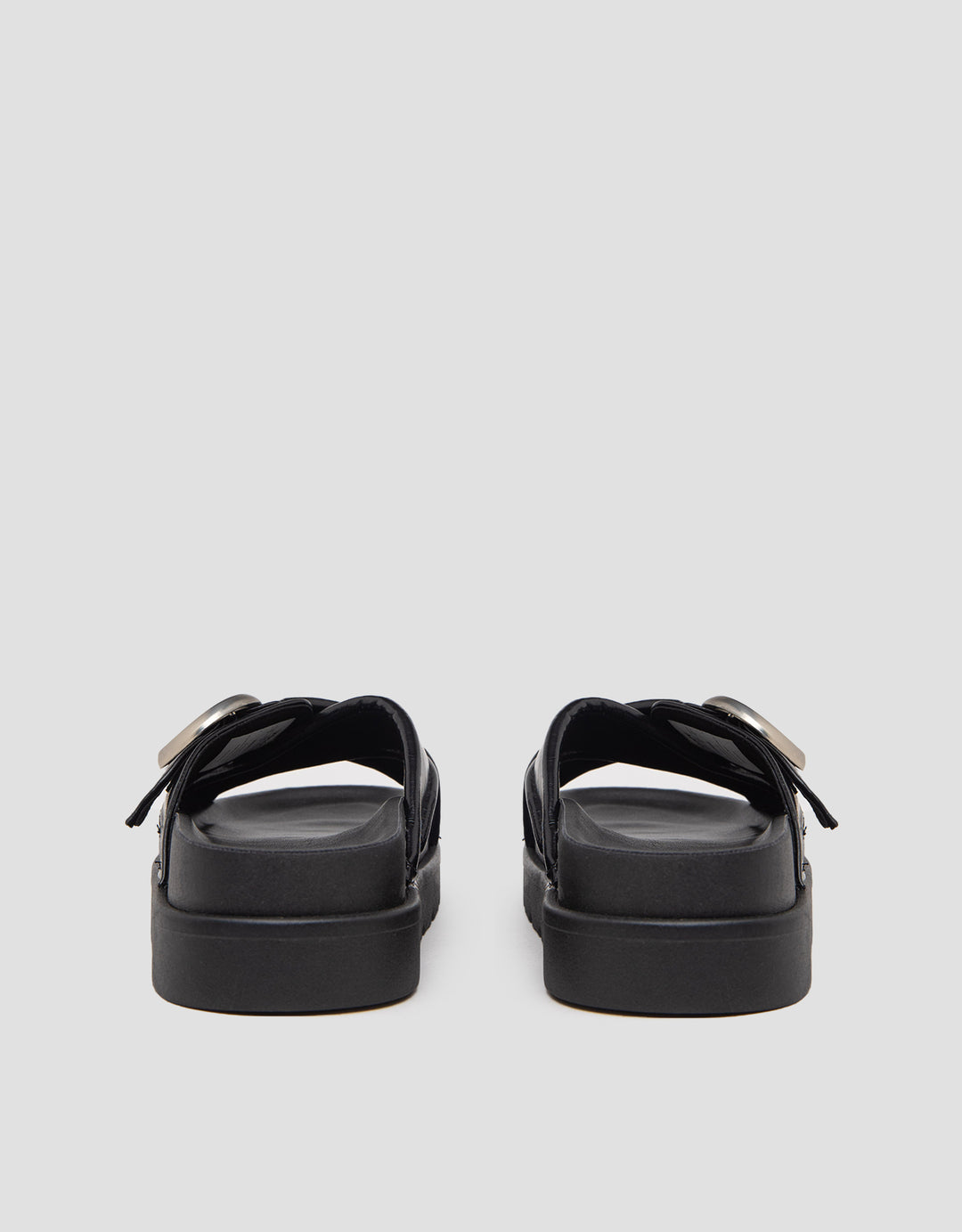 Sandal wanita dengan desain modern dengan strap silang yang sleek dan buckle metal sebagai aksen mewah. Warna hitam glossy memberi kesan bold, classy, dan mudah dipadukan dengan berbagai outfit—dari kasual hingga semi-formal.