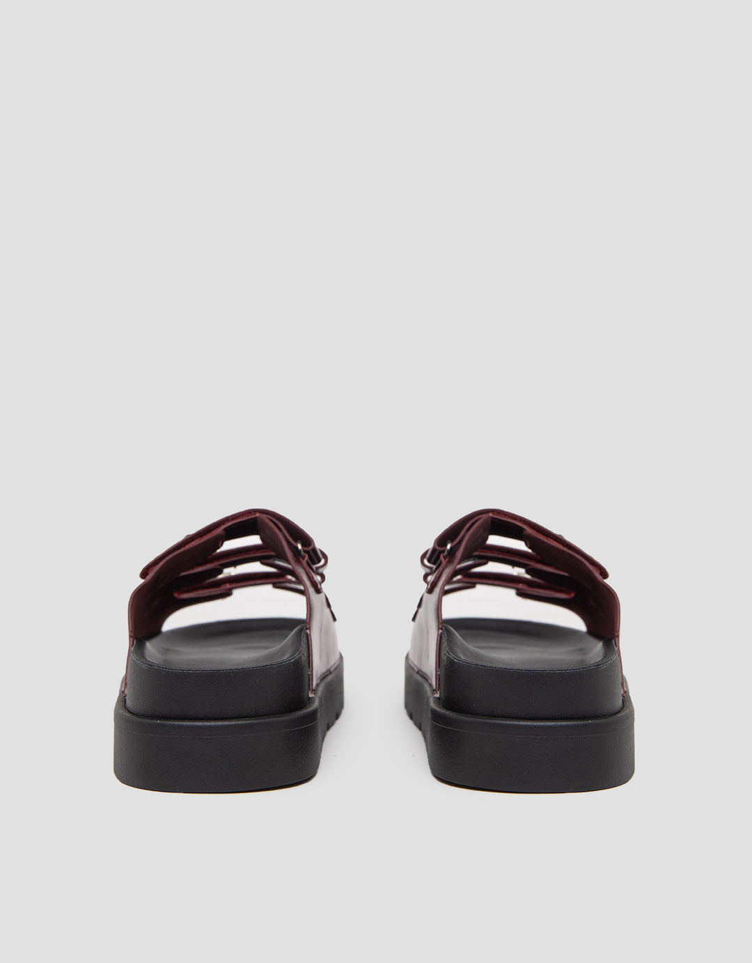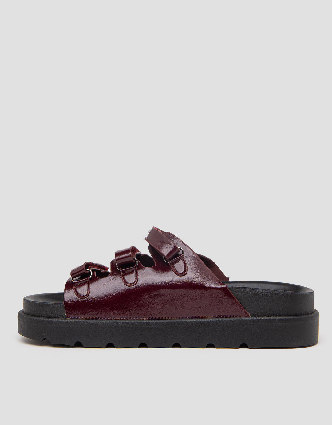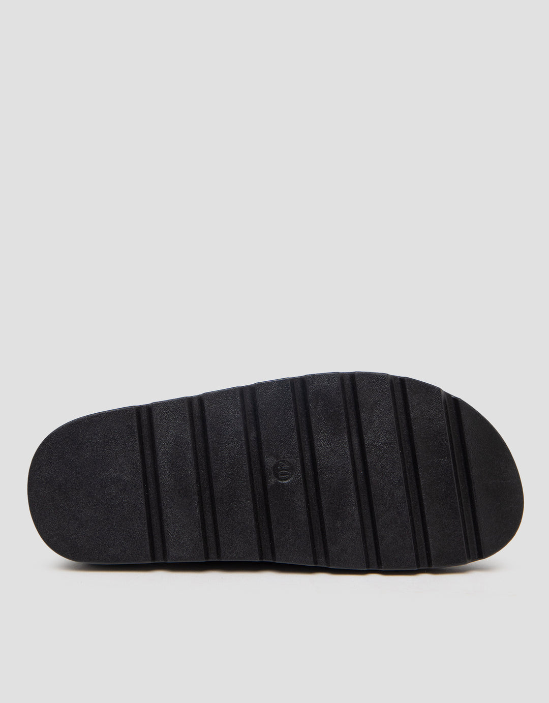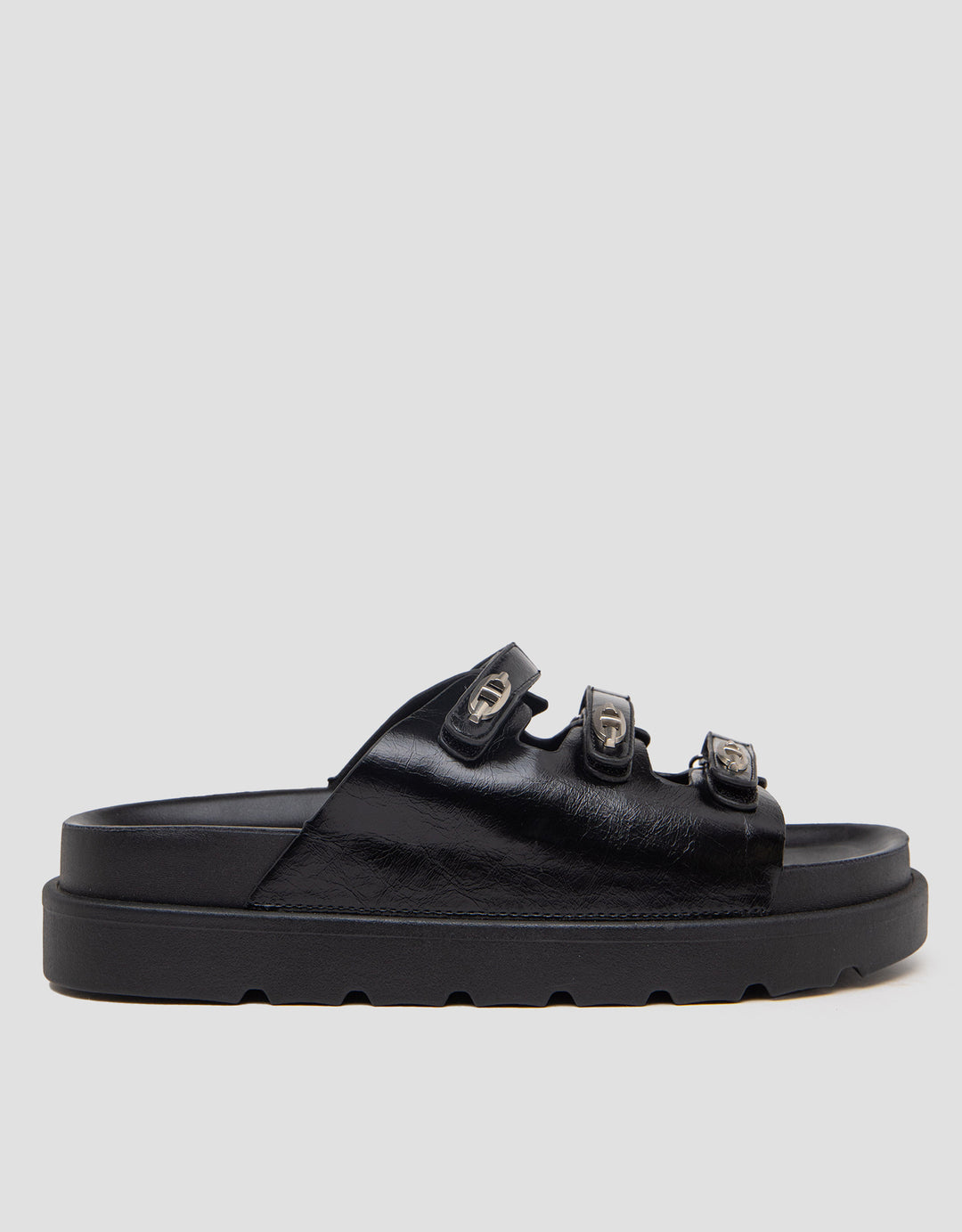 Sandal wanita dengan desain modern dengan strap silang yang sleek dan buckle metal sebagai aksen mewah. Warna hitam glossy memberi kesan bold, classy, dan mudah dipadukan dengan berbagai outfit—dari kasual hingga semi-formal.