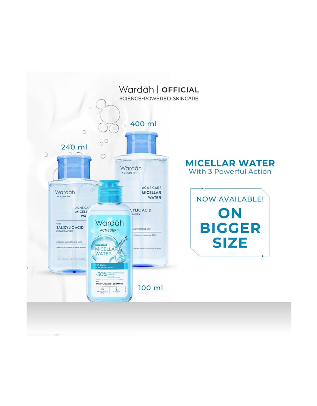 Wardah Acnederm Acne Care Micellar Water, pembersih tanpa bilas dengan teknologi IntelliCleanse BarrierTM, yang selektif mengangkat kotoran untuk 2x kulit lebih bersih*, cocok untuk merawat kulit berminyak hingga mudah berjerawat. Dengan 3 Powerful Actions, membersihkan kotoran, minyak berlebih, dan sisa makeup, menenangkan kulit kemerahan, dan menjaga skin barrier. Dengan Salicylic Acid, Cica Complex**, dan Ceramide membantu melawan bakteri penyebab timbulnya jerawat dan terbukti kurangi 50% tanda jerawat dalam 2 minggu*.