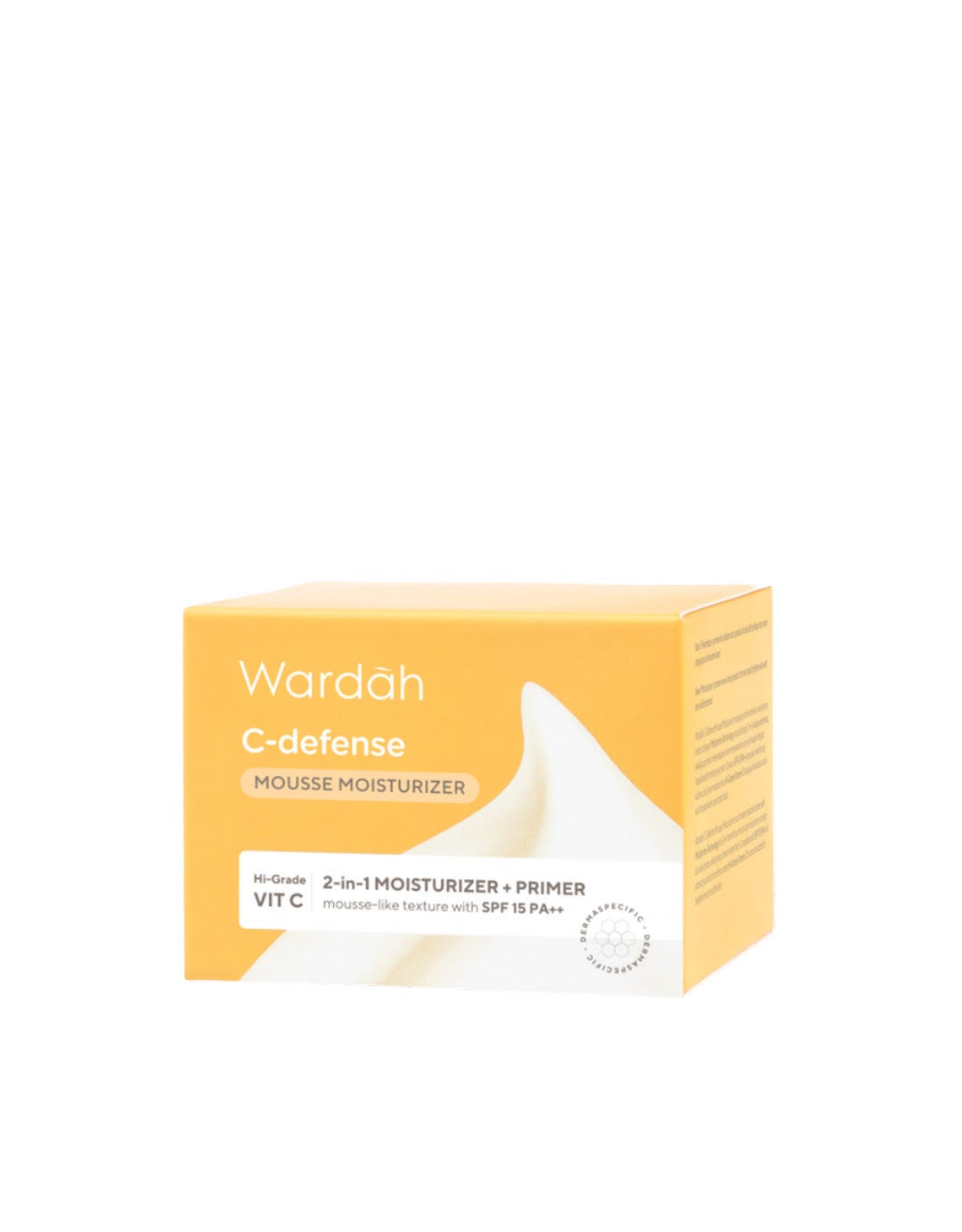 Wardah C-defense Mousse Moisturizer, krim bertekstur velvet yang lembut dengan MoistprimeTechnology yang berfungsi 2-in-1 sebagai pelembap sekaligus primer: melembabkan dan menyamarkanpori-pori wajah, dengan tampilan akhir matte yang fresh. Dengan SPF 15 PA++ yang akan melindungikulitmu dari sinar matahari dan Hi-Grade Vitamin C sebagai antioksidan untuk kulit tampak lebih cerah danhalus