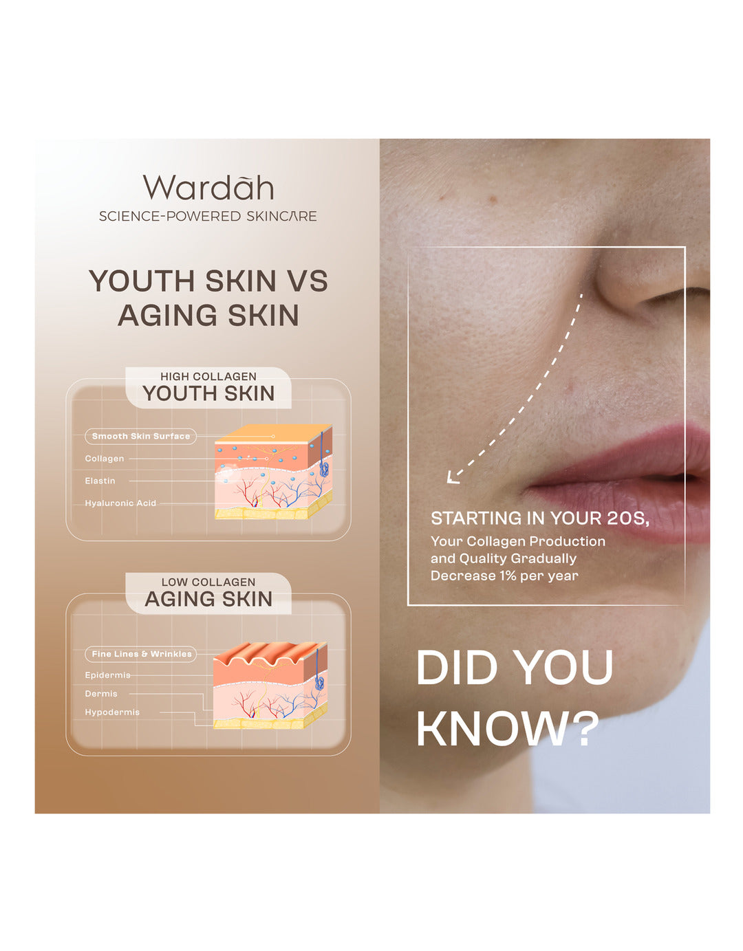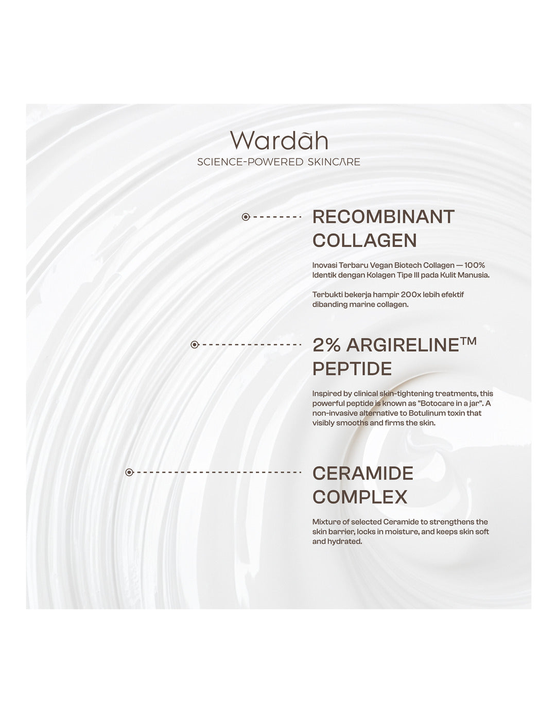 Formula revolusioner dengan vegan Biotech Recombinant Collagen untuk menjaga produksi alami kolagen dan elastisitas kulit. Diperkaya dengan 2% ArgirelineTM Peptide, memberikan efek pengencangan yang terinspirasi perawatan klinik, BotocareTM, tanpa prosedur invasif. Teksturnya ringan dan cepat meresap, merawat elastisitas, kekencangan, dan menghaluskan kulit secara intensif.
